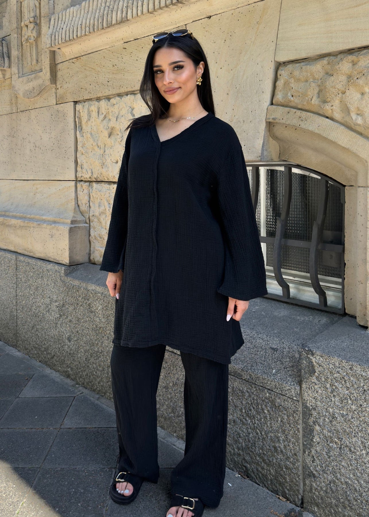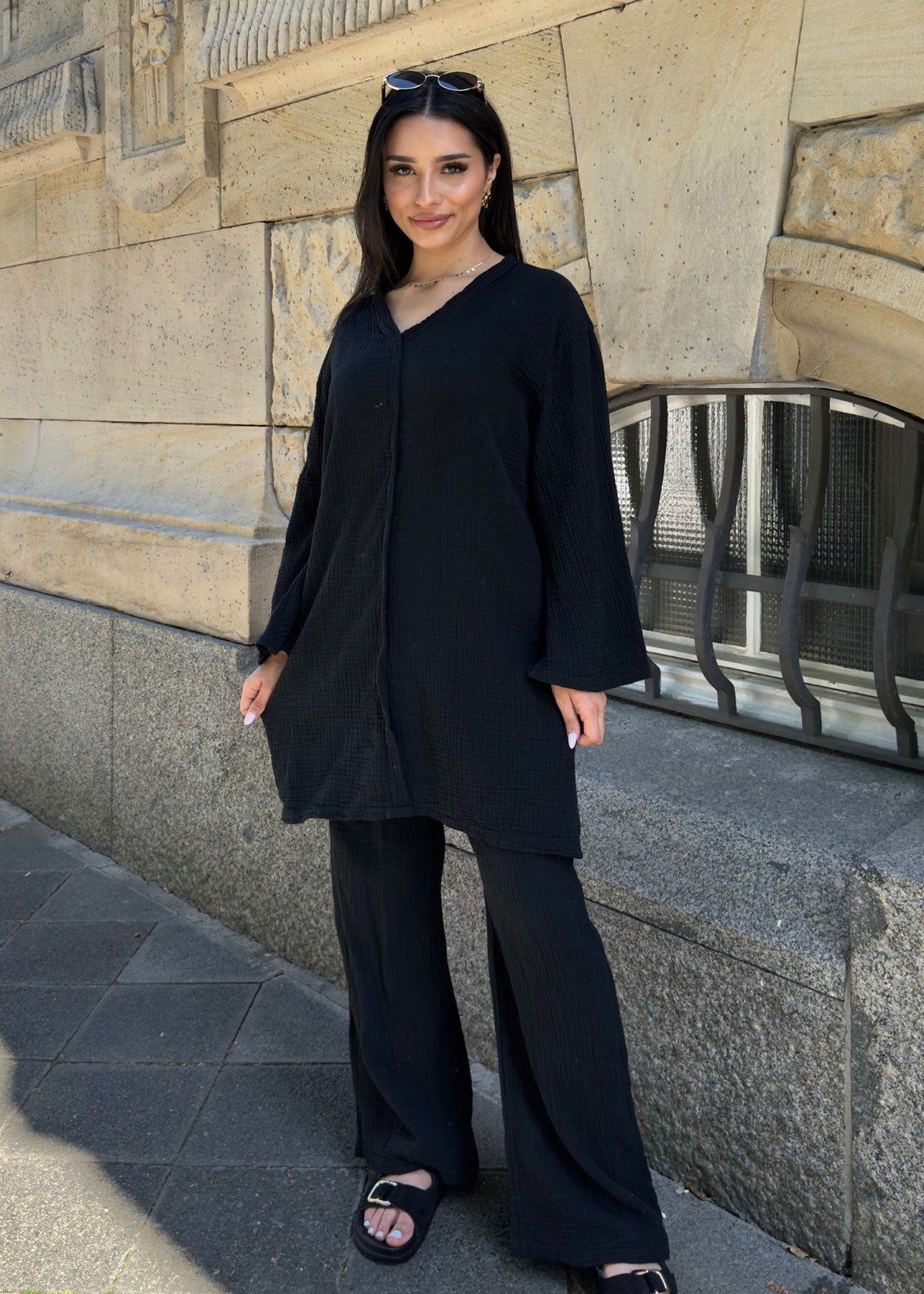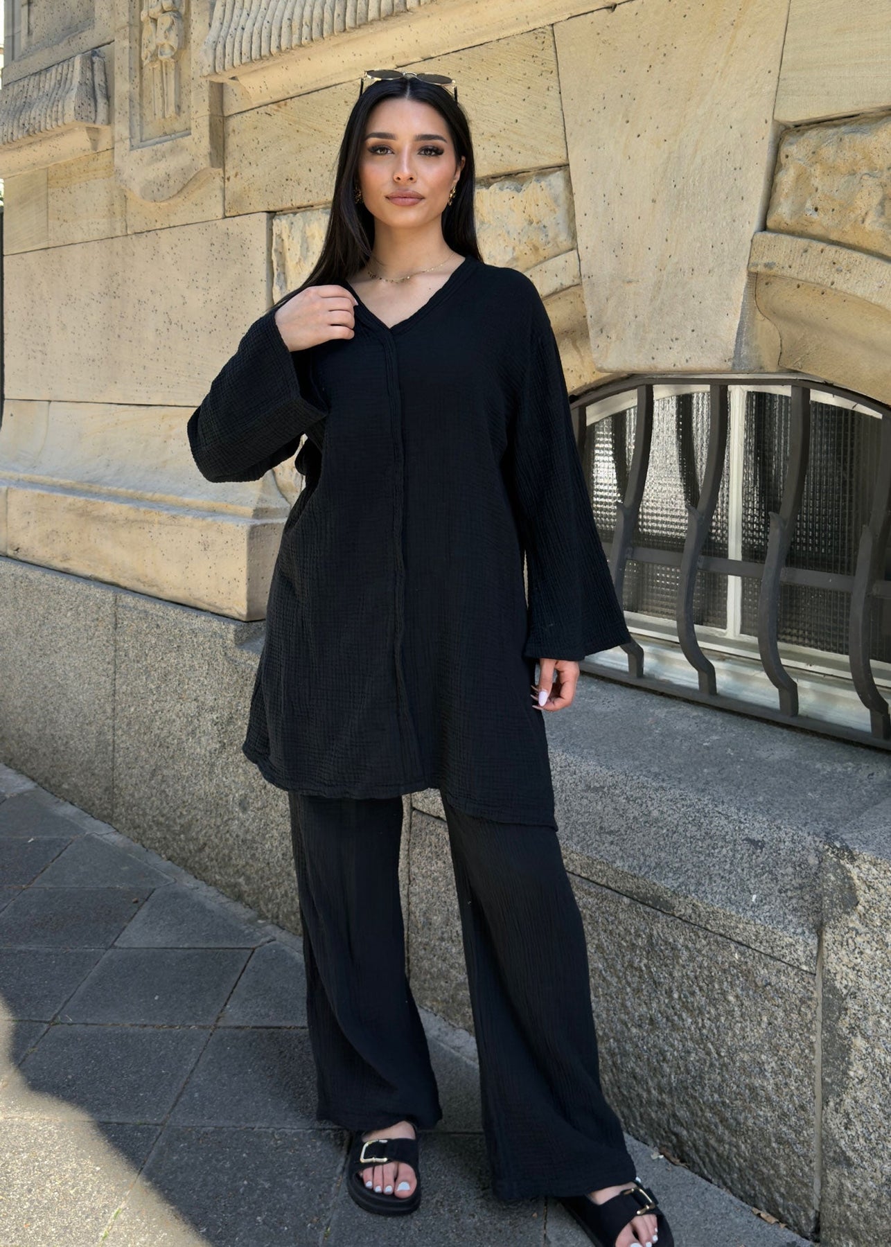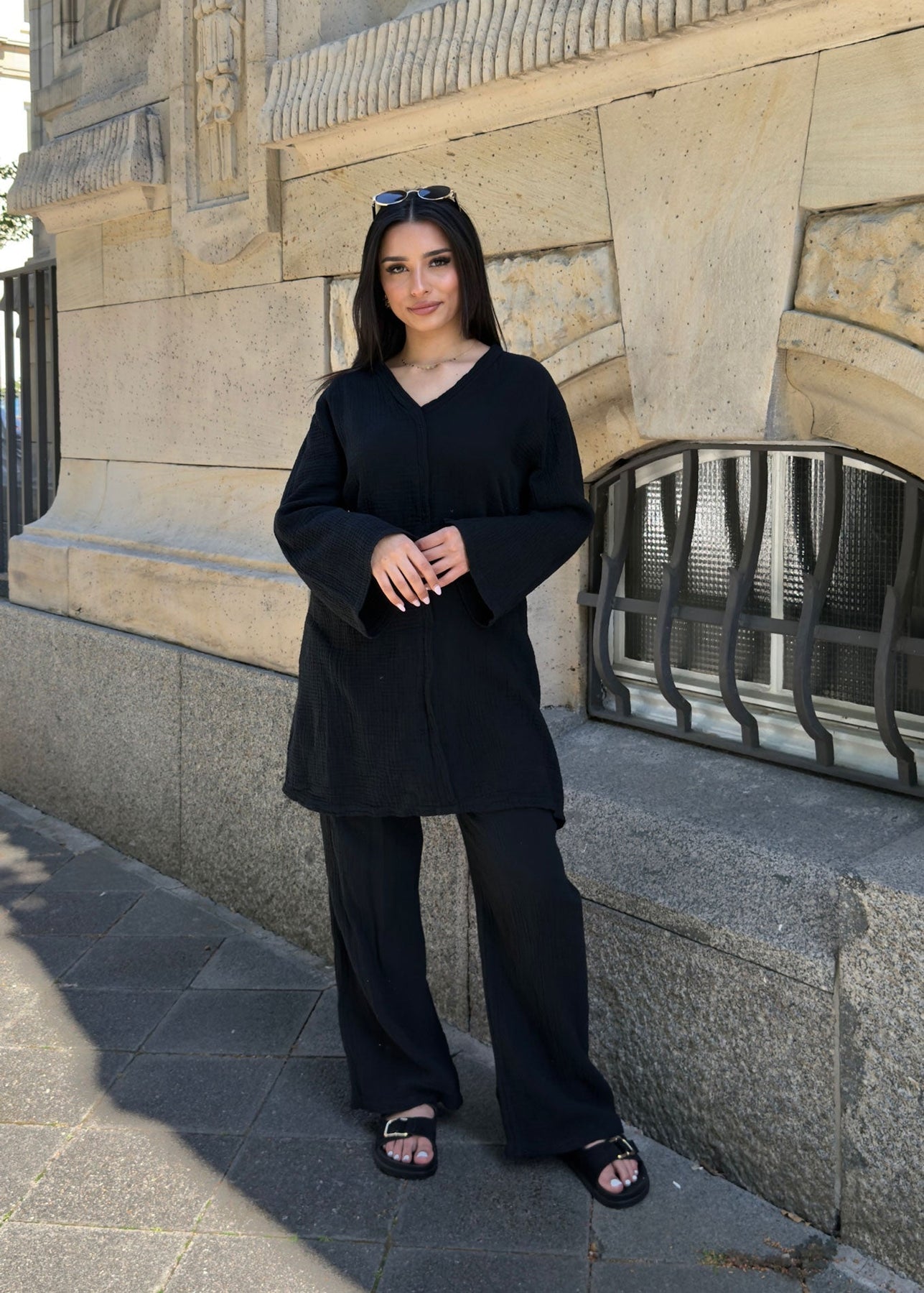 Luftig, locker, lässig: Dieses zweiteilige Set aus 100 % Baumwoll-Musselin vereint Komfort mit stilvoller Leichtigkeit. Das lange Oberteil mit V-Ausschnitt und weiten Ärmeln trifft auf fließende, weit geschnittene Hosen – perfekt für warme Tage und entspannte Looks. Atmungsaktiv, weich und ideal für den Alltag oder den Urlaub.
