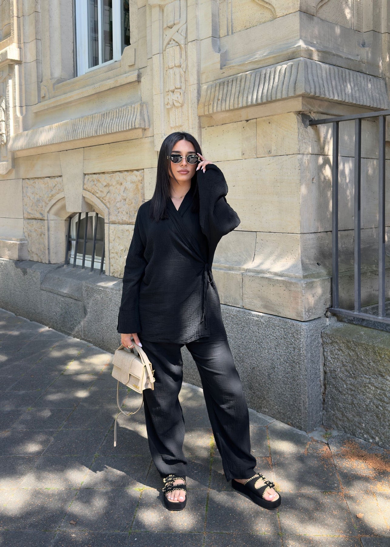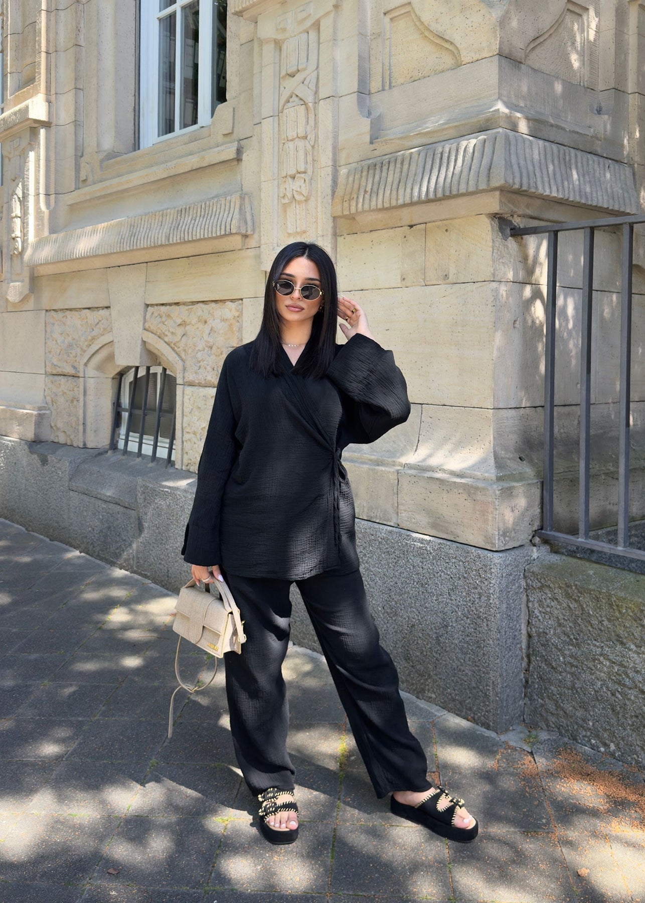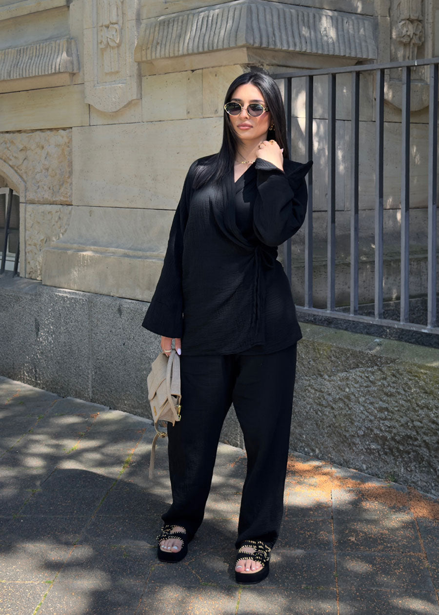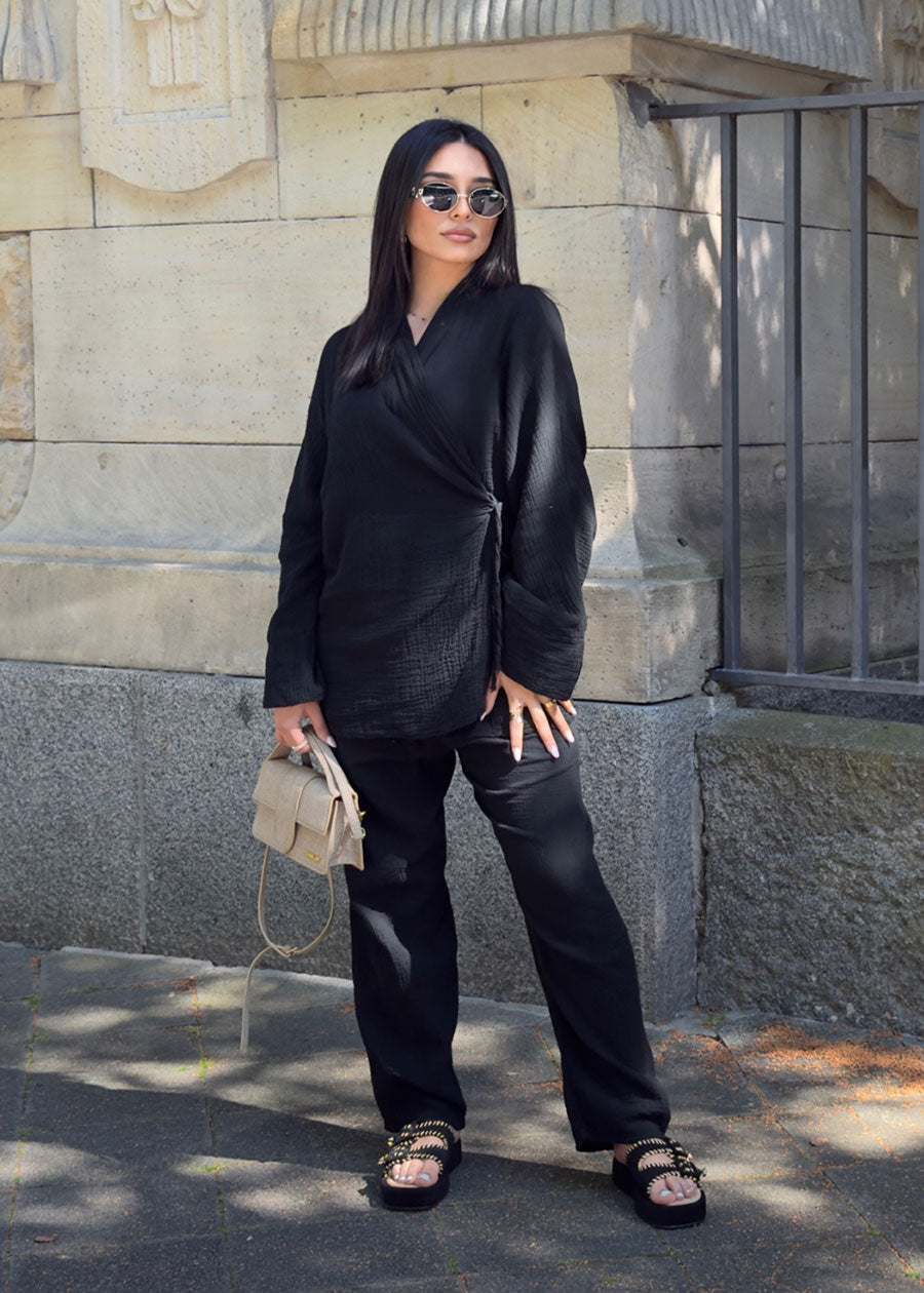 Dieses zweiteilige Set aus weicher, atmungsaktiver Baumwolle vereint Komfort und Stil. Die Wickelbluse mit weitem Ärmel und V-Ausschnitt sorgt für eine schmeichelhafte Silhouette, während die locker geschnittene Hose mit Gummibund maximale Bewegungsfreiheit bietet.