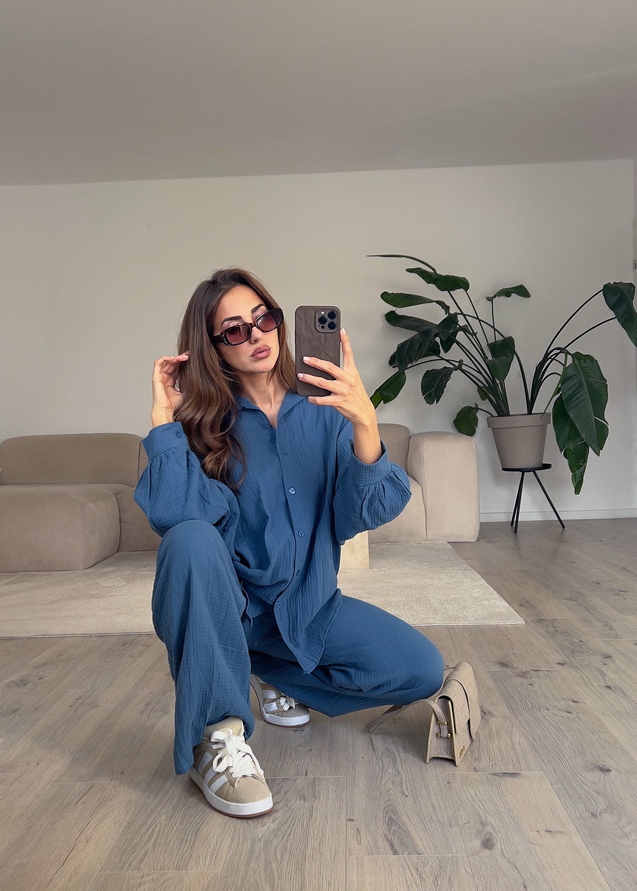 Lässiger Zweiteiler aus weicher Musseline, bestehend aus einem oversized Hemd mit Knopfleiste und weit geschnittenen Ärmeln sowie einer lockeren Hose mit elastischem Bund. Das atmungsaktive Material sorgt für höchsten Tragekomfort – perfekt für entspannte Alltagslooks oder stylische Freizeitoutfits.