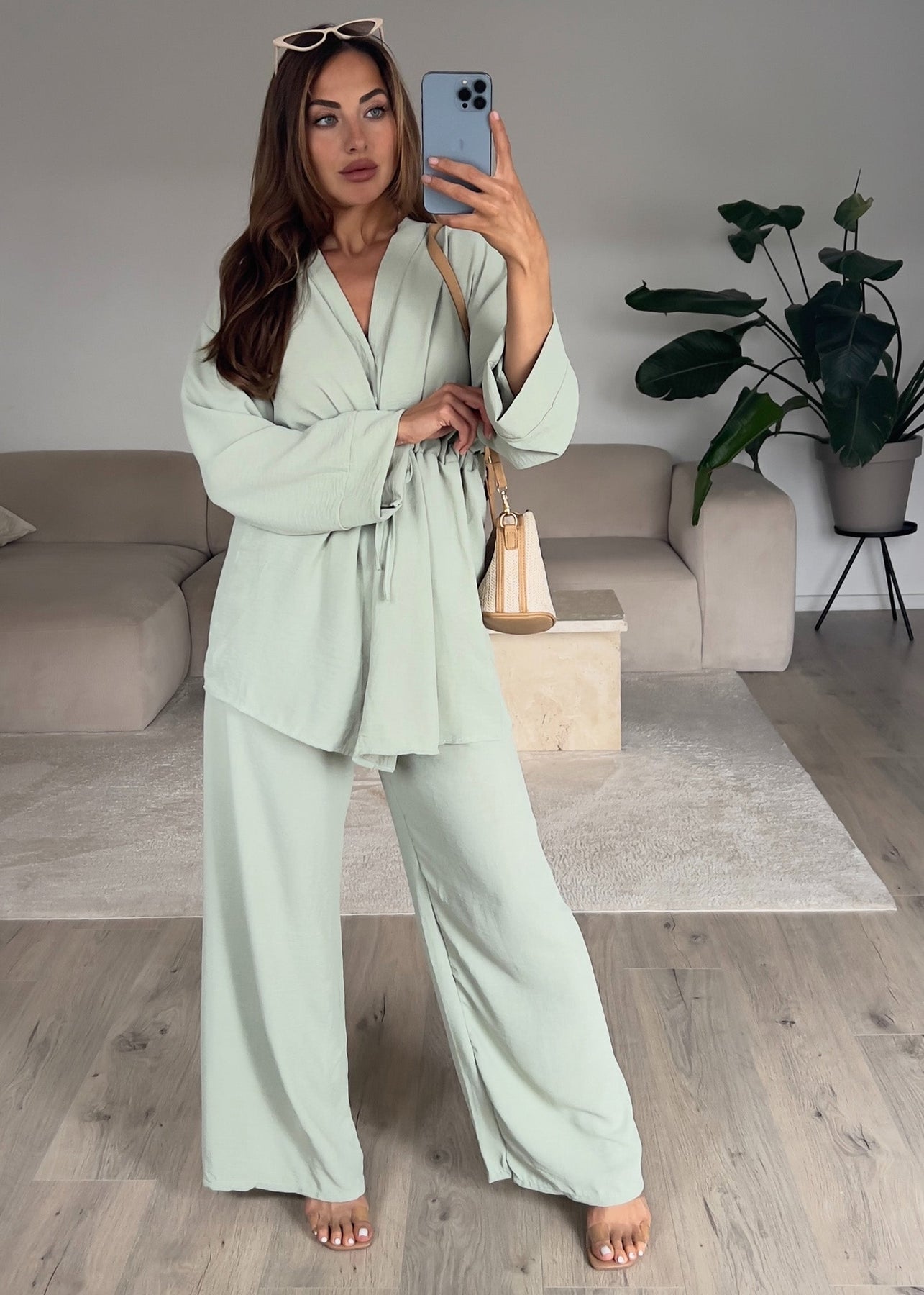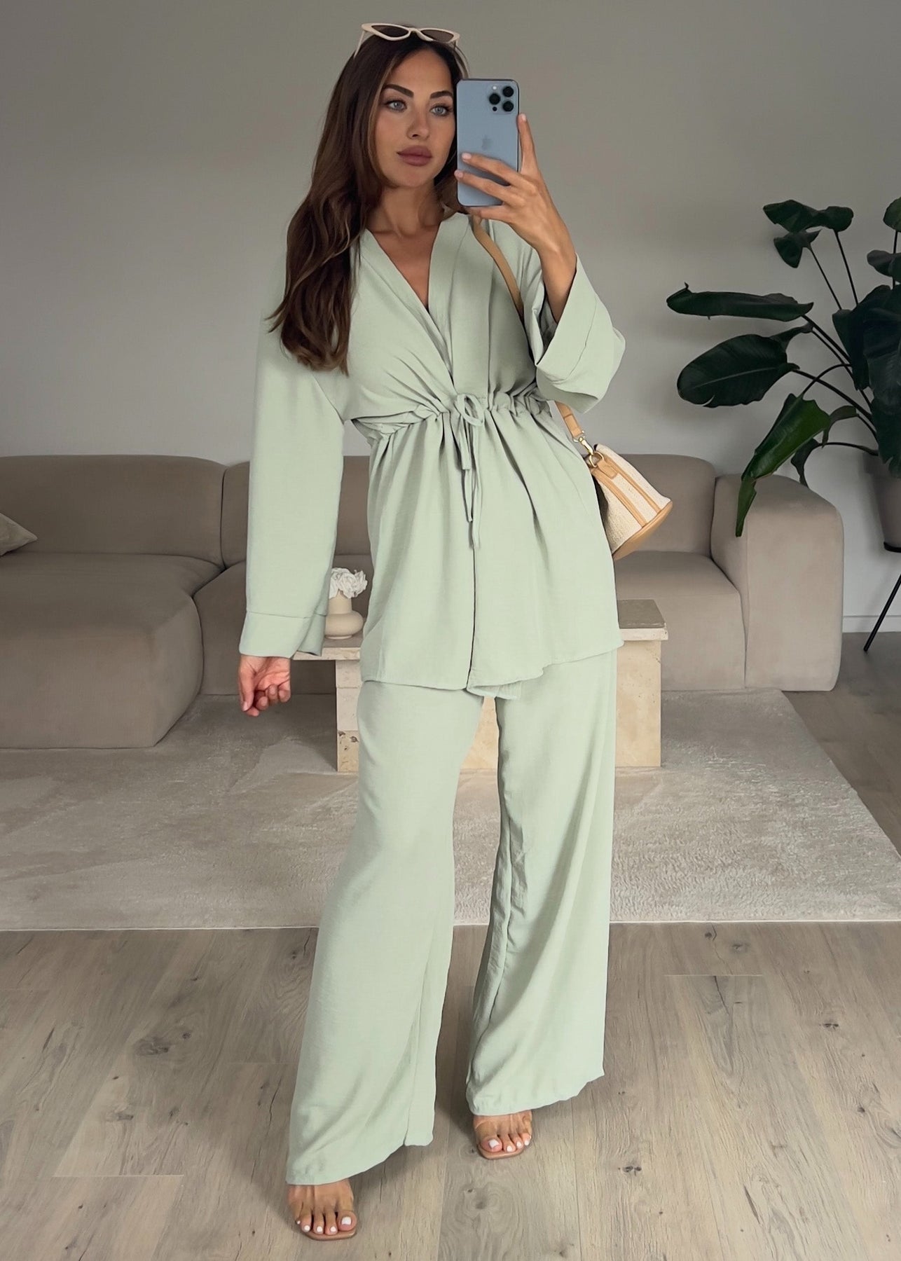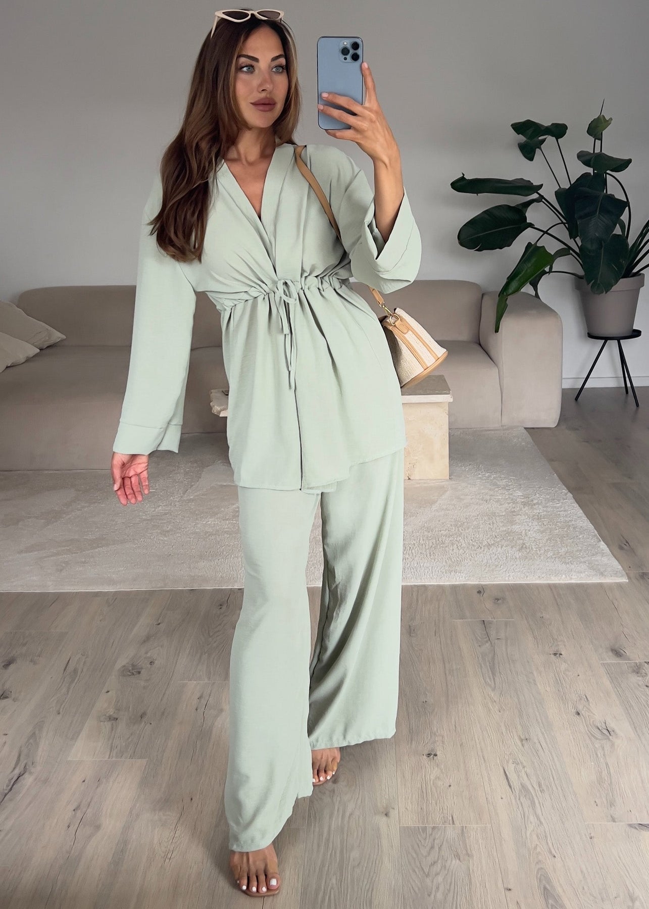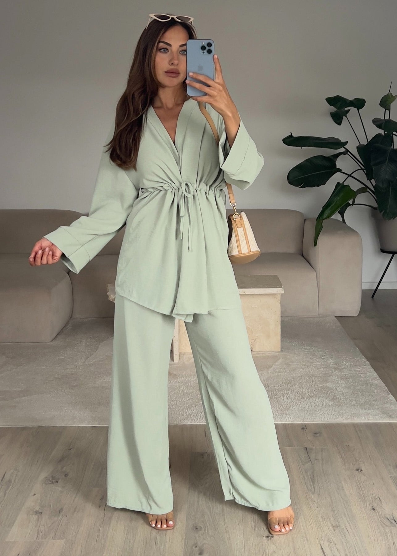 Dieses Zweiteiler-Set kombiniert Komfort mit moderner Eleganz. Die weit geschnittene Hose in Kombination mit der locker fallenden Tunika-Jacke mit Taillenzug zaubert eine schmeichelhafte Silhouette und sorgt gleichzeitig für maximale Bewegungsfreiheit.