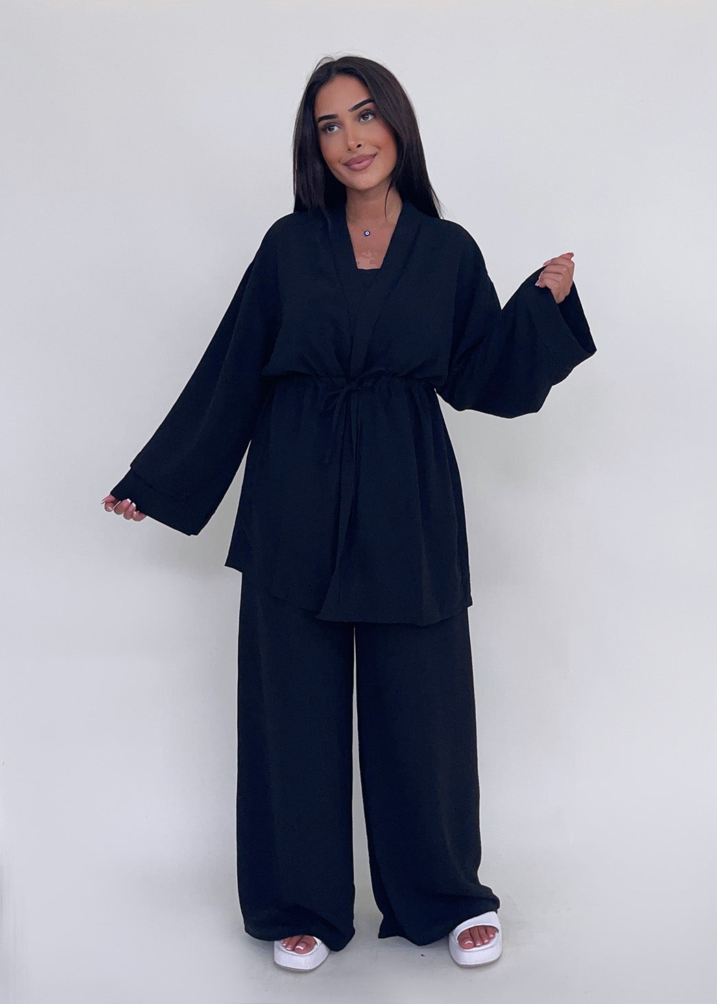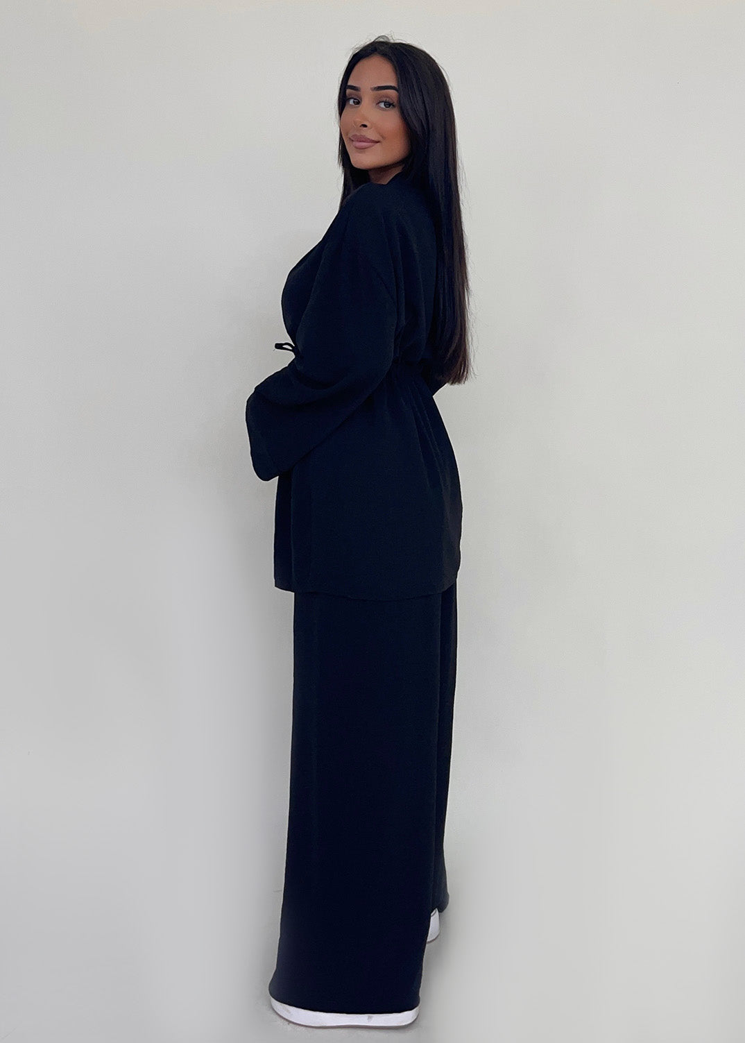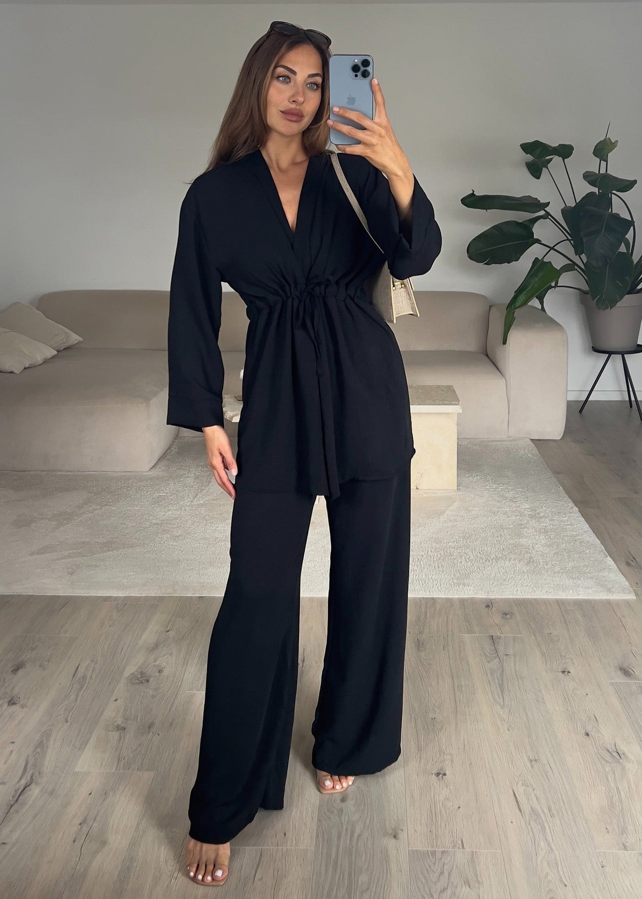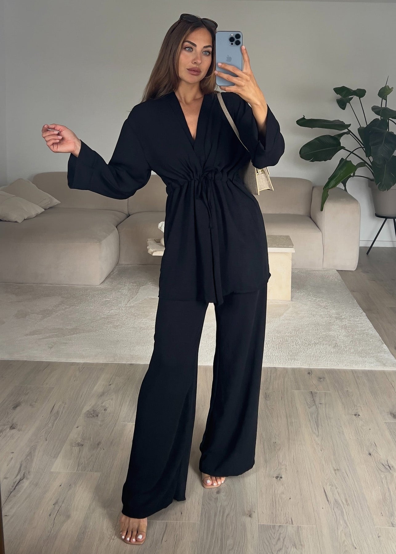 Dieses Zweiteiler-Set kombiniert Komfort mit moderner Eleganz. Die weit geschnittene Hose in Kombination mit der locker fallenden Tunika-Jacke mit Taillenzug zaubert eine schmeichelhafte Silhouette und sorgt gleichzeitig für maximale Bewegungsfreiheit.