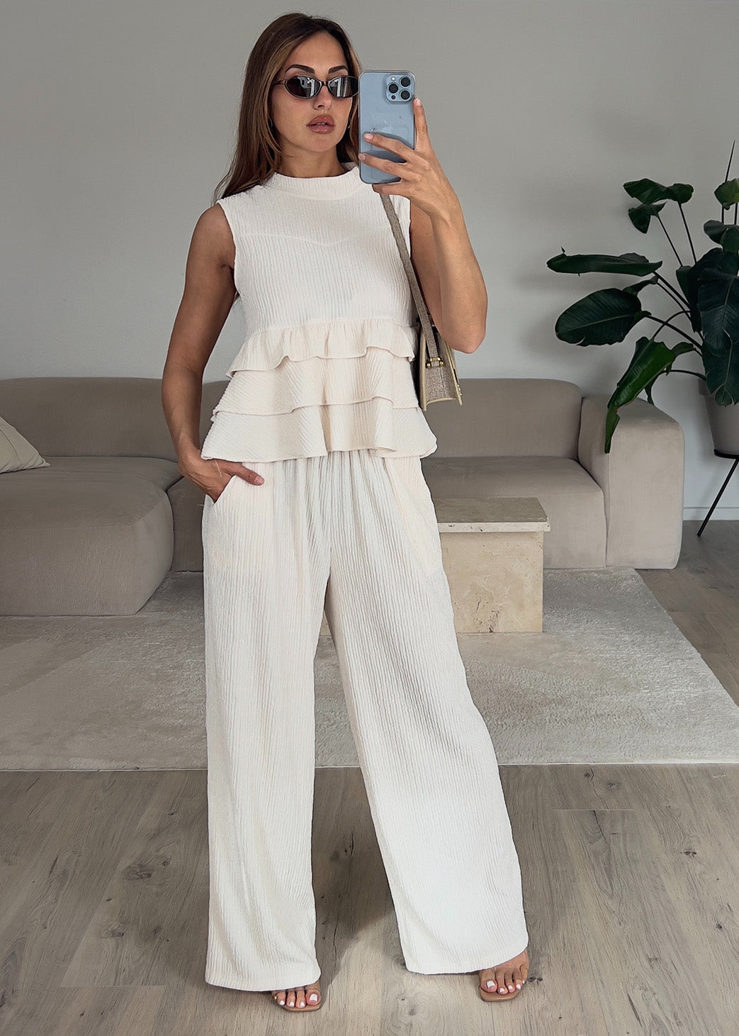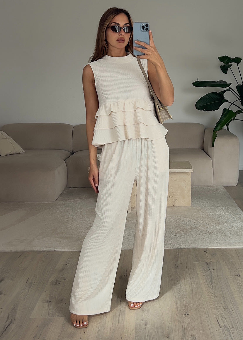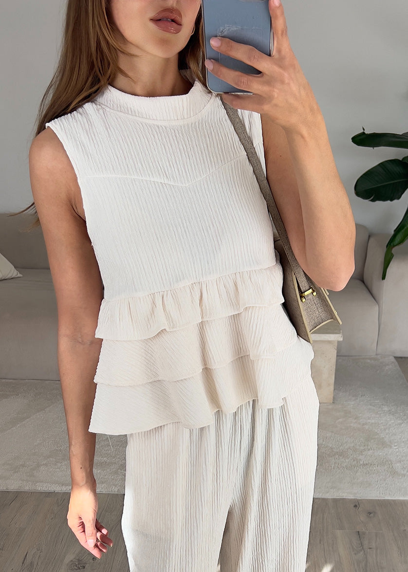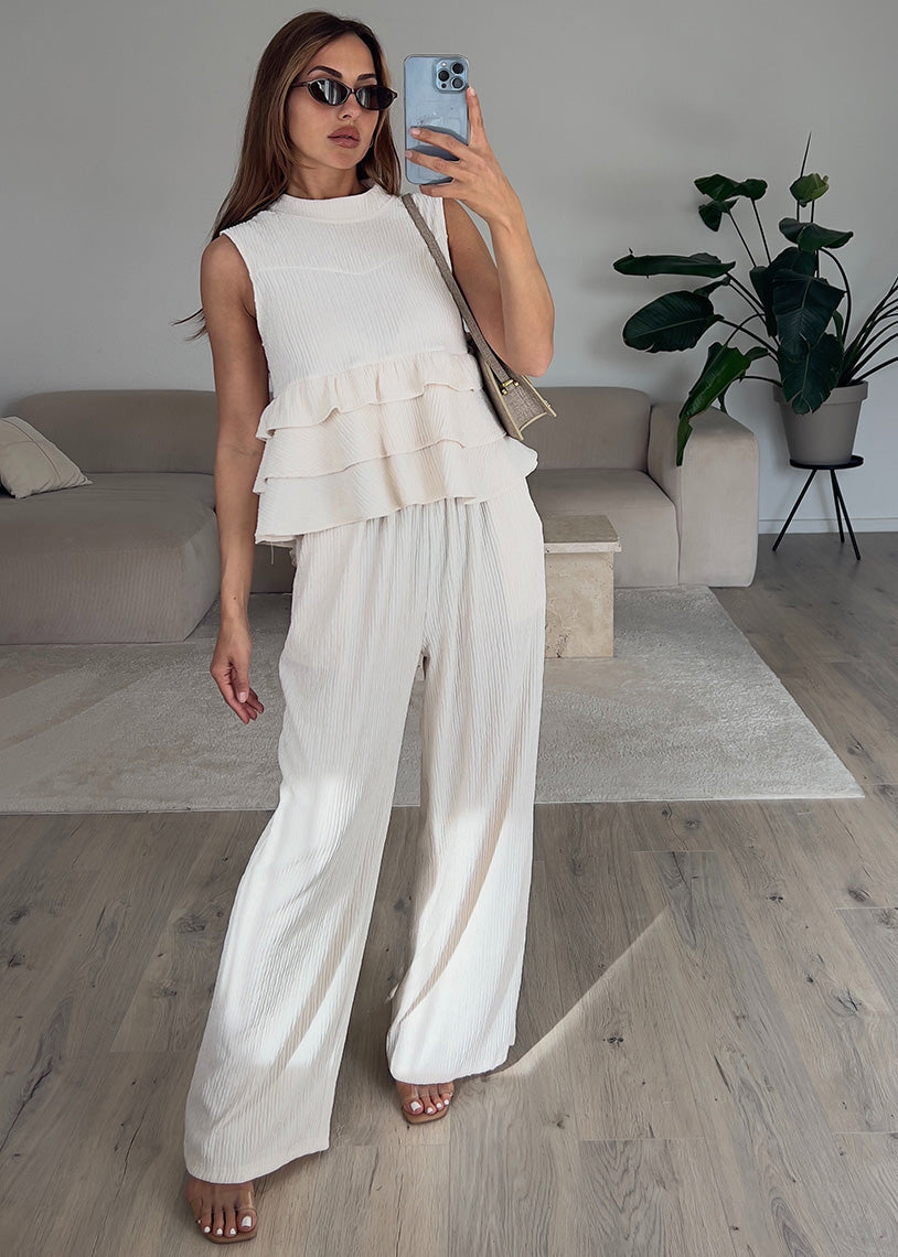 Zweiteiler Set mit Rüschen-Top Beige
