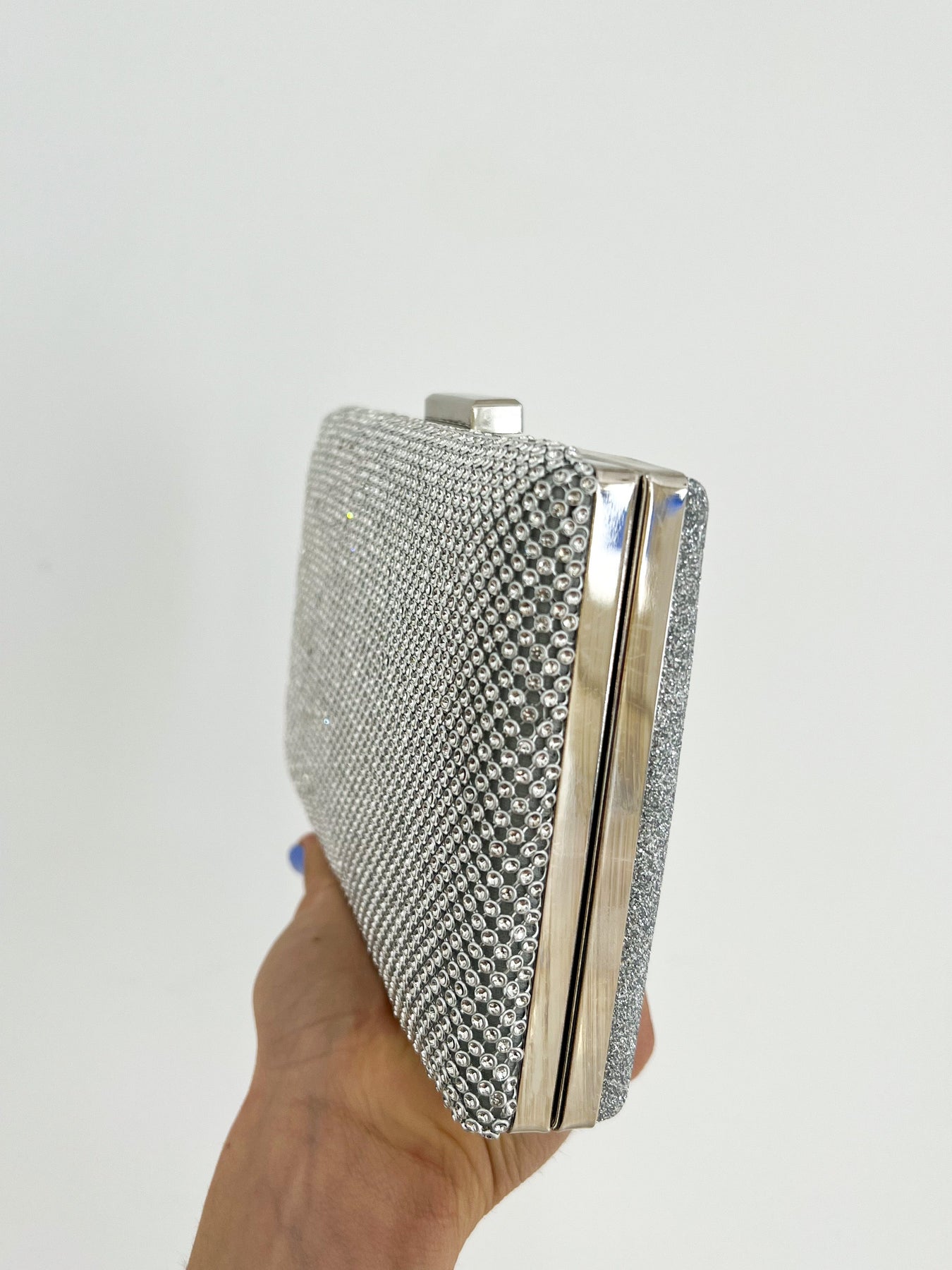 Handbag with shiny effect. It has a removable chain. Rectangular clasp. Rectangular shape