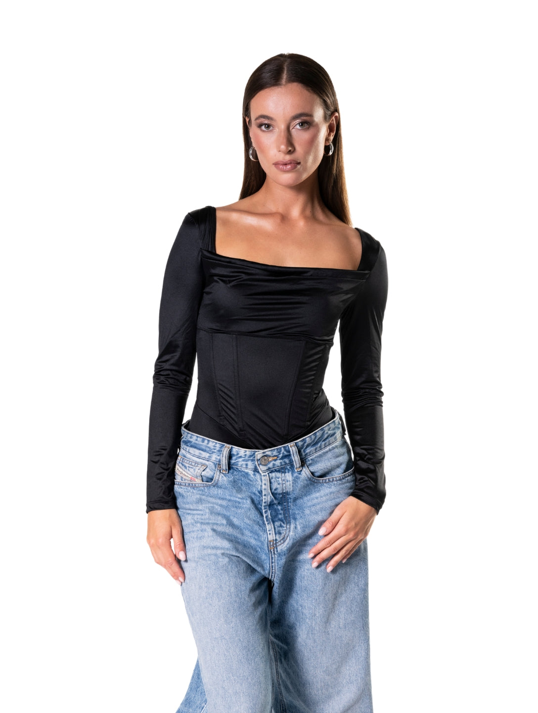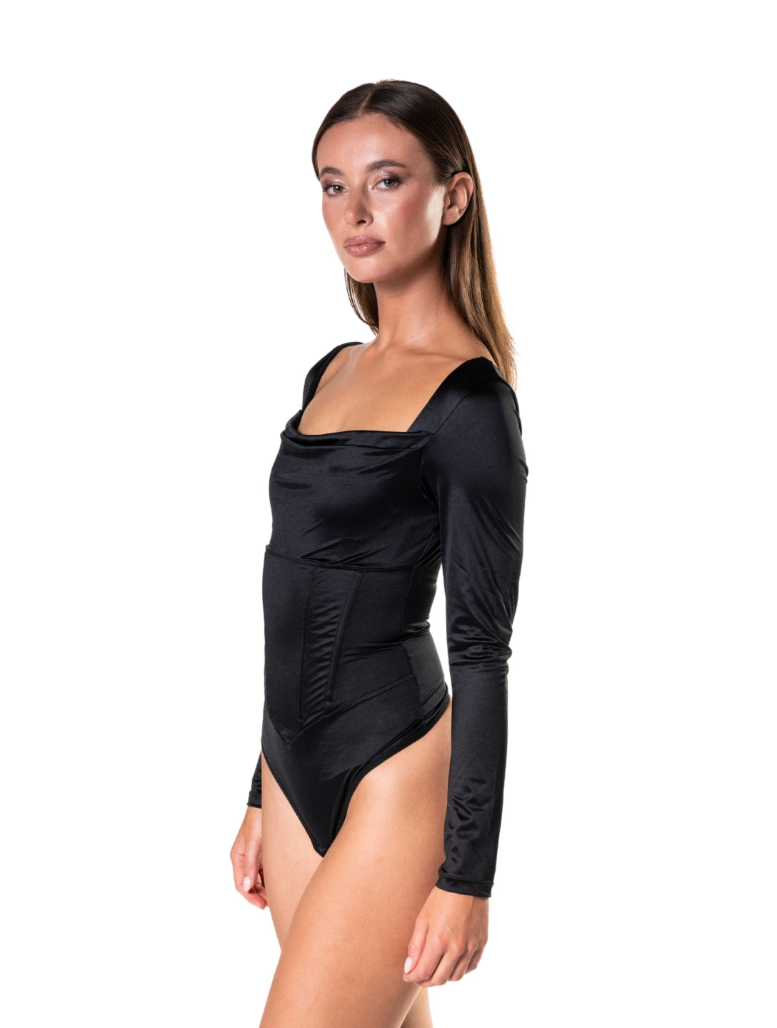 Verleihe deinem Stil mit unserem eleganten Satin-Body mit Wasserfallausschnitt das gewisse Etwas. Mit seinem Schwingkragen-Design, dem herausnehmbaren Brustpolster und dem Mesh-Material zur Taillenstraffung bietet dieser Body Halt, Form und Komfort. Der schöne Rückenausschnitt und das integrierte Korsett betonen deine Silhouette. Dank langer Ärmel und Knopf im Schritt ist er besonders bequem.