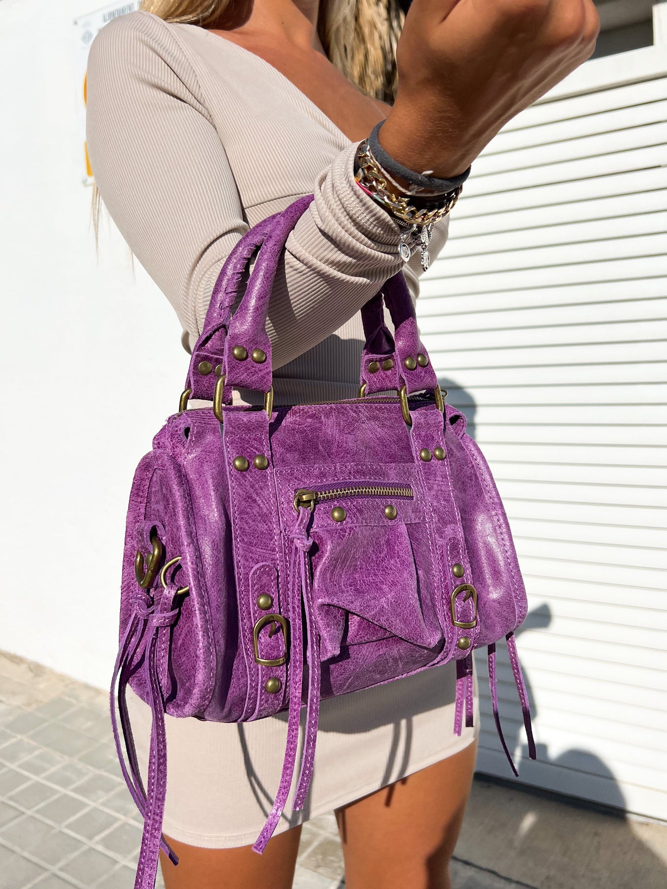 Leather midi bag with decorative buckle detail.Adjustable detachable shoulder strap, front zippered pocket, zippered top closure, main compartment, interior zippered pocket.