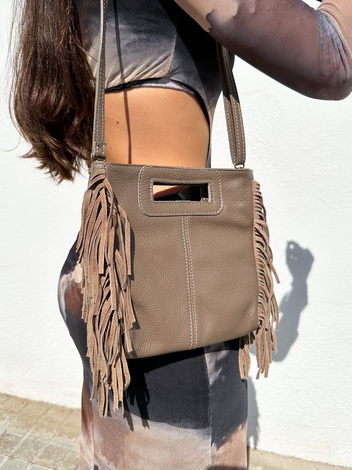 Leather effect bag with side bangs, removable and adjustable strap. Multiposition type handle or hanging, with inside zipper.