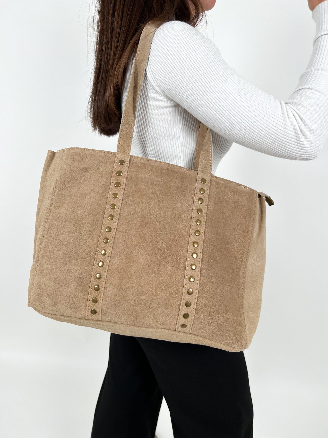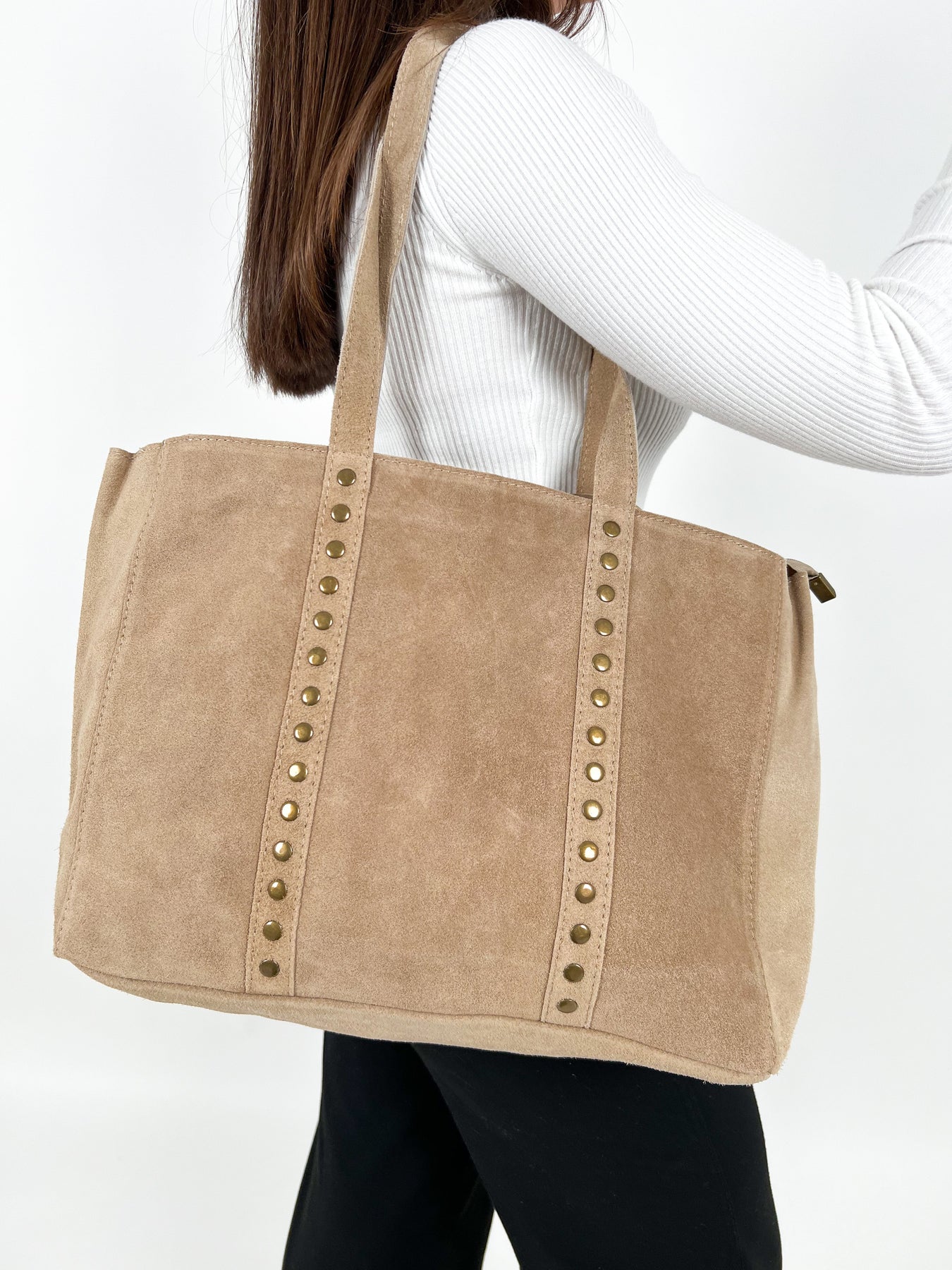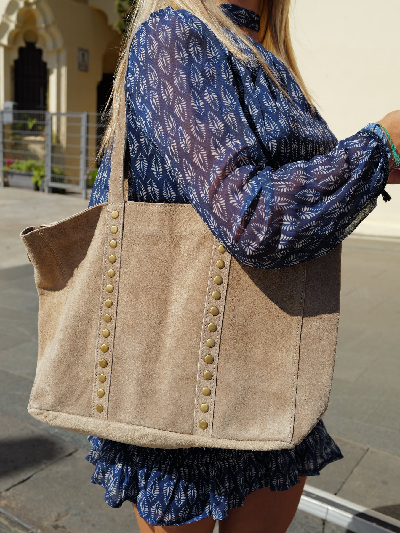Leather bag in suede finish, large bag type. Detail of round studs, ideal size to put computer and books. Inside has zippered pocket