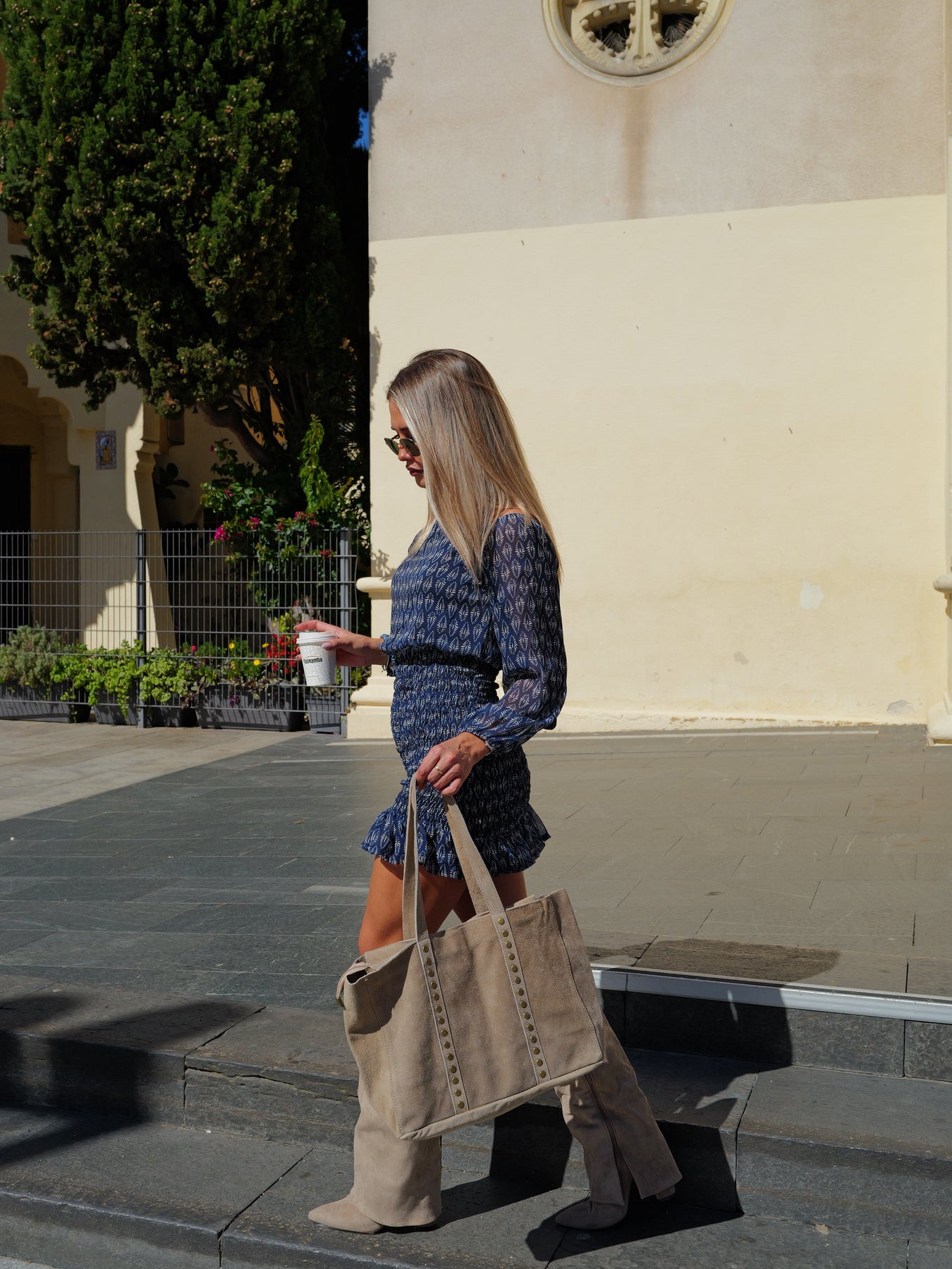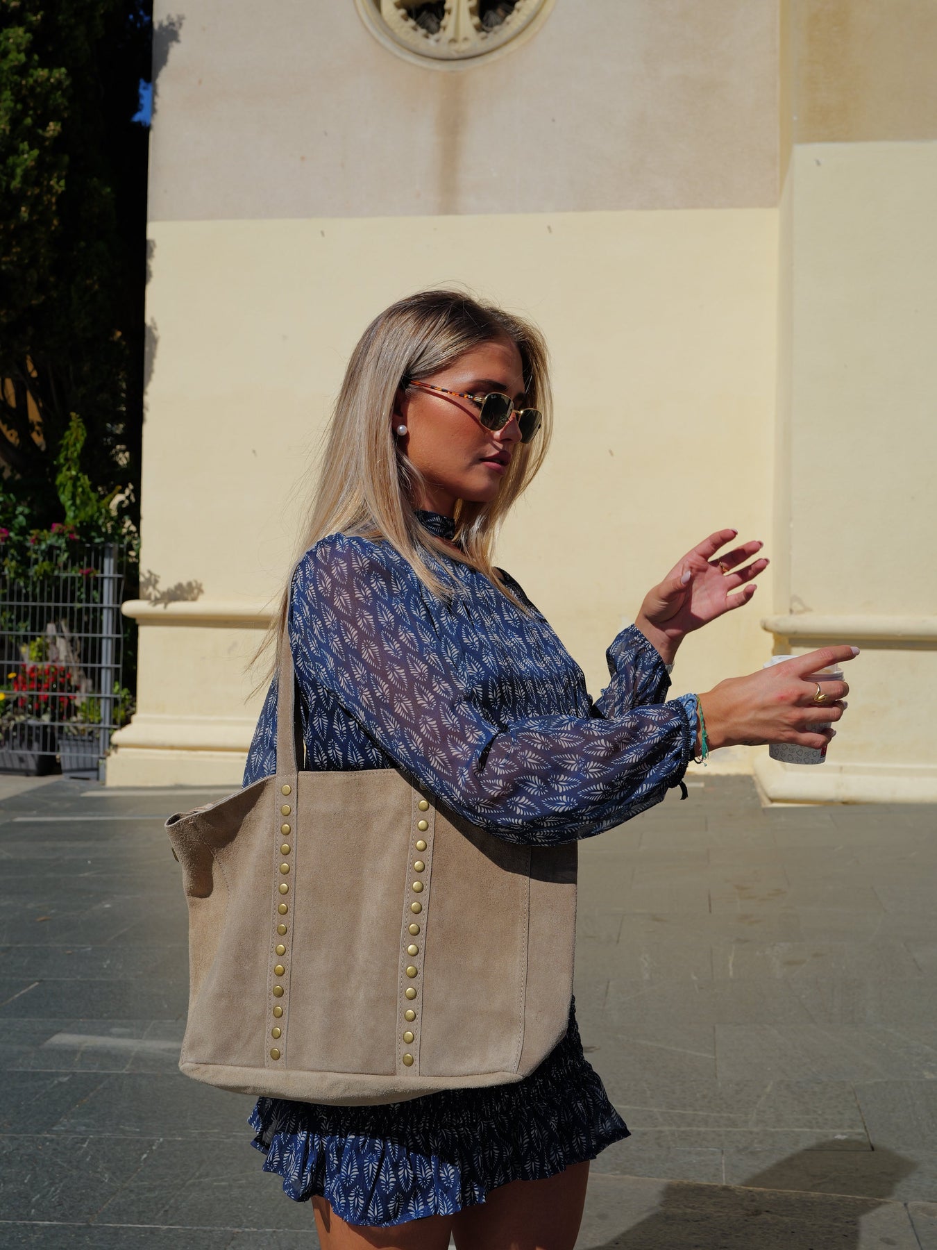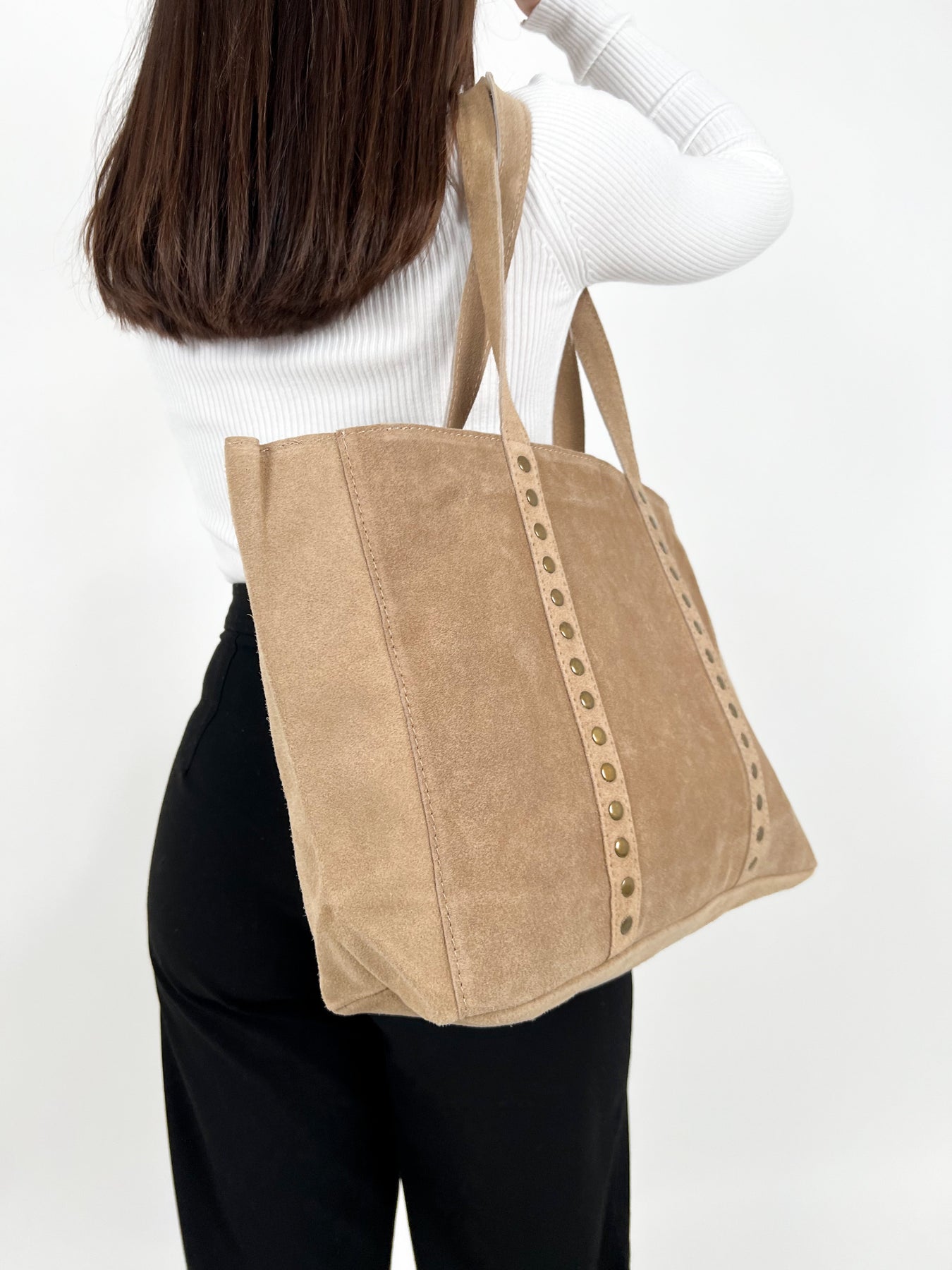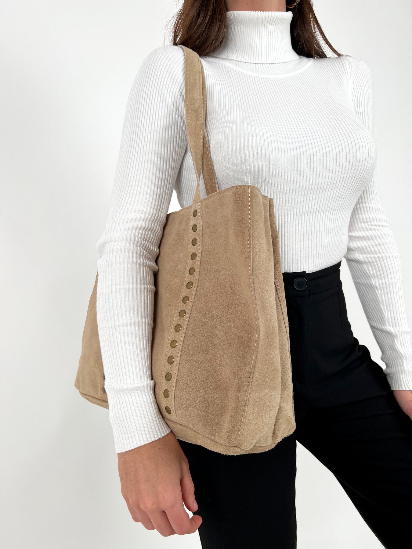 Leather bag in suede finish, large bag type. Detail of round studs, ideal size to put computer and books. Inside has zippered pocket