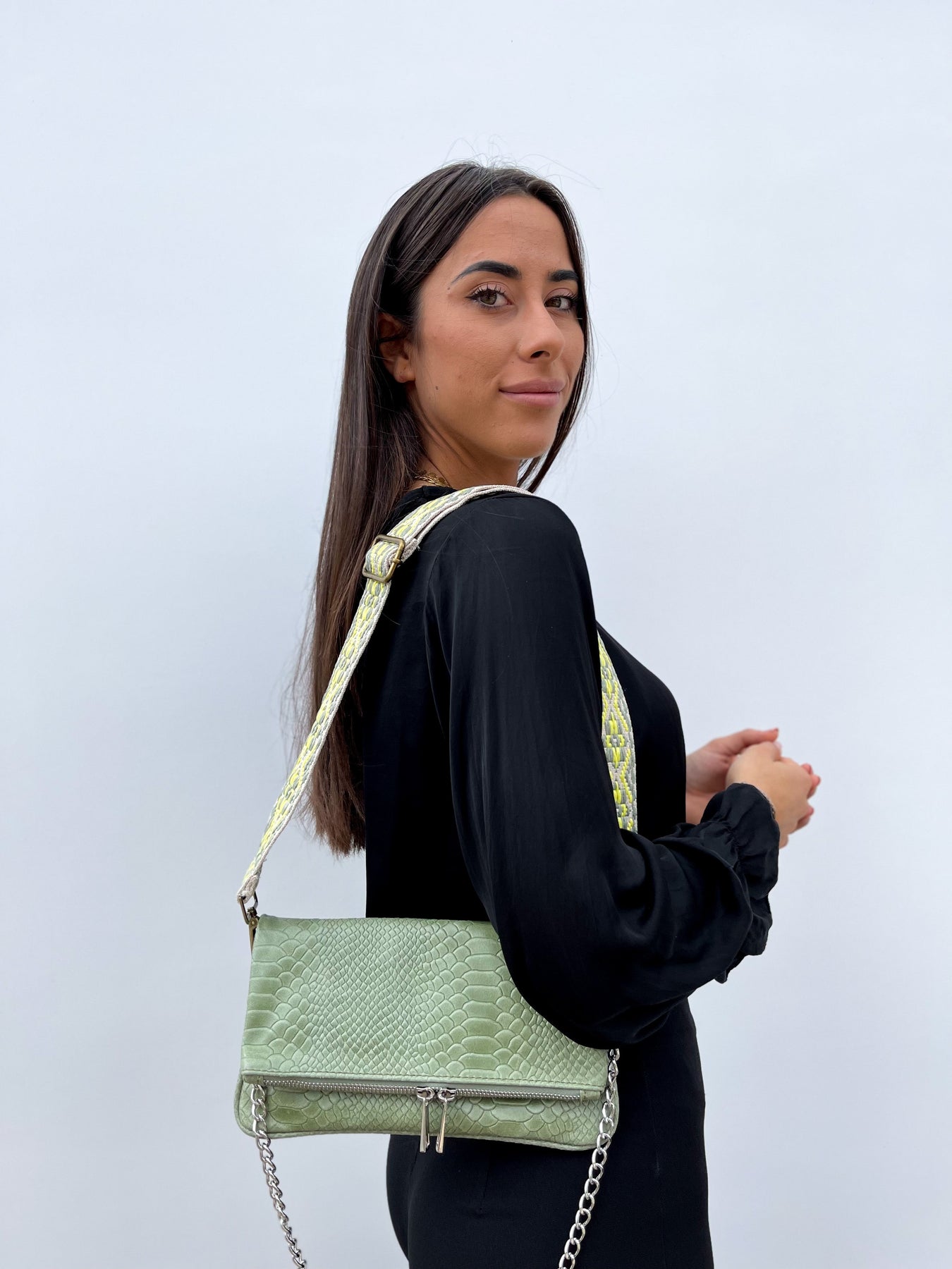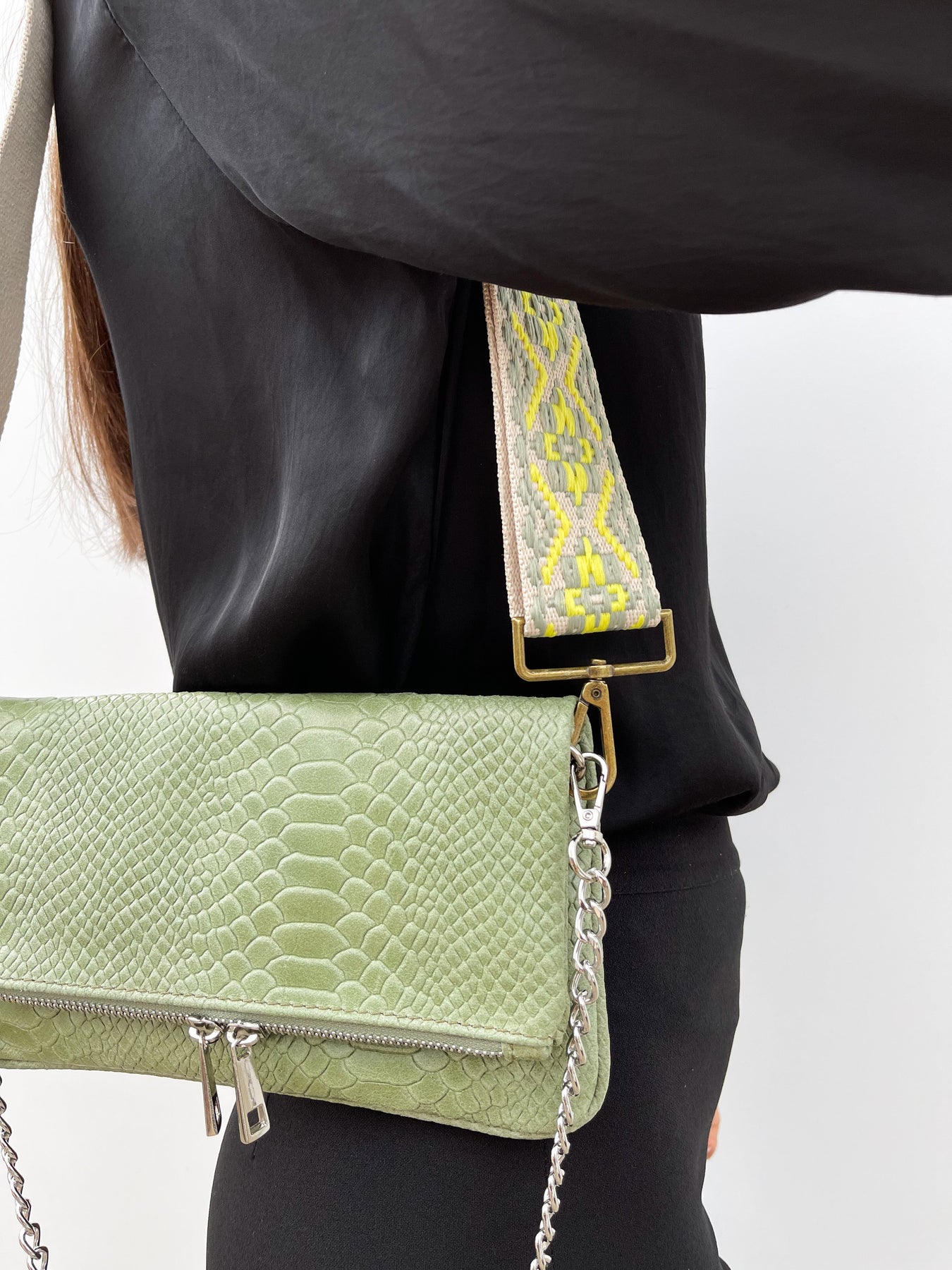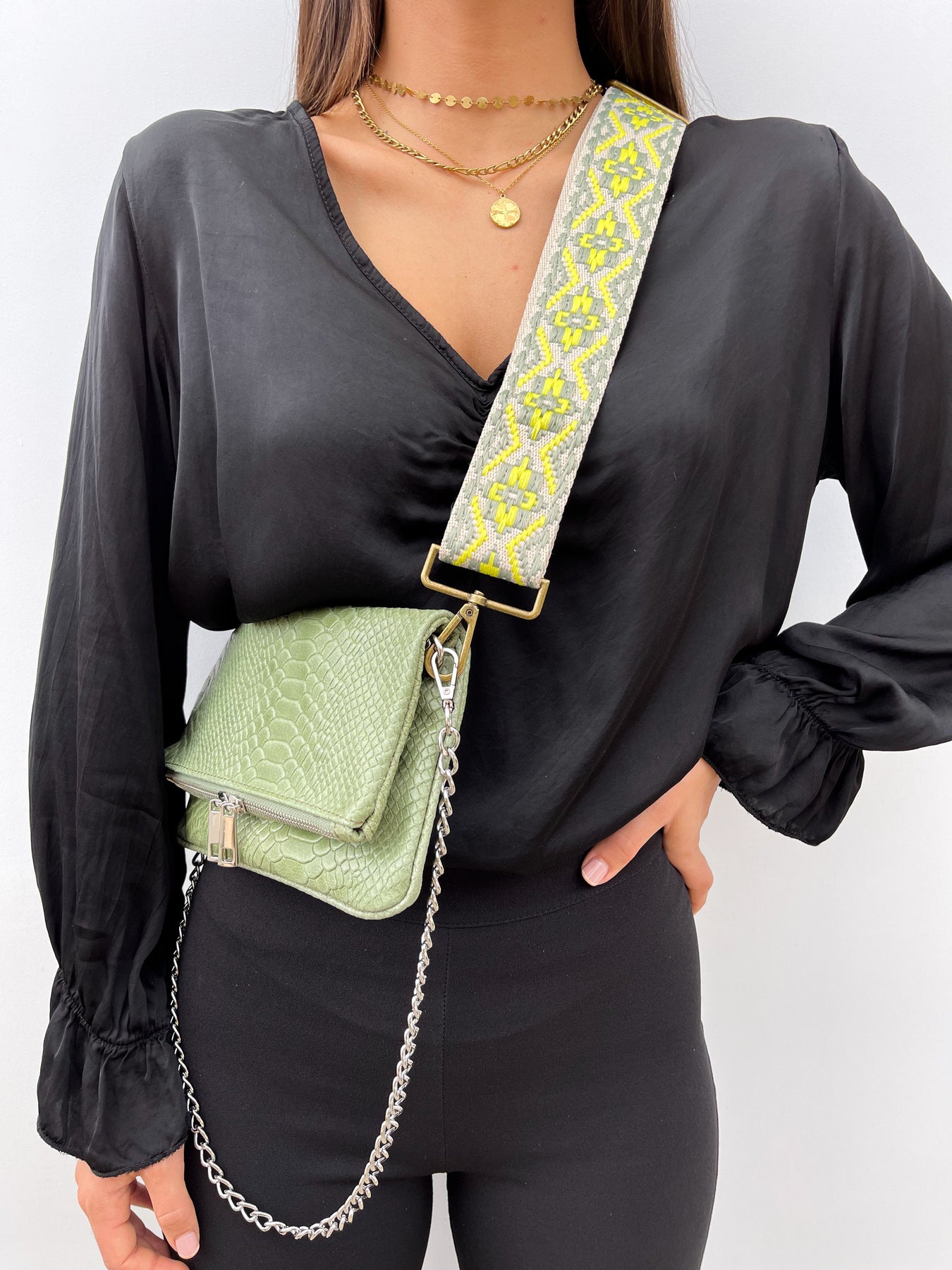 Multicolor chain shoulder strap with worn gold finish. The length can be adjusted and worn as a baguette or shoulder strap (bag not included).