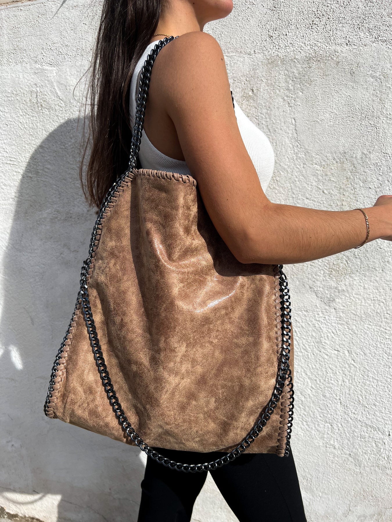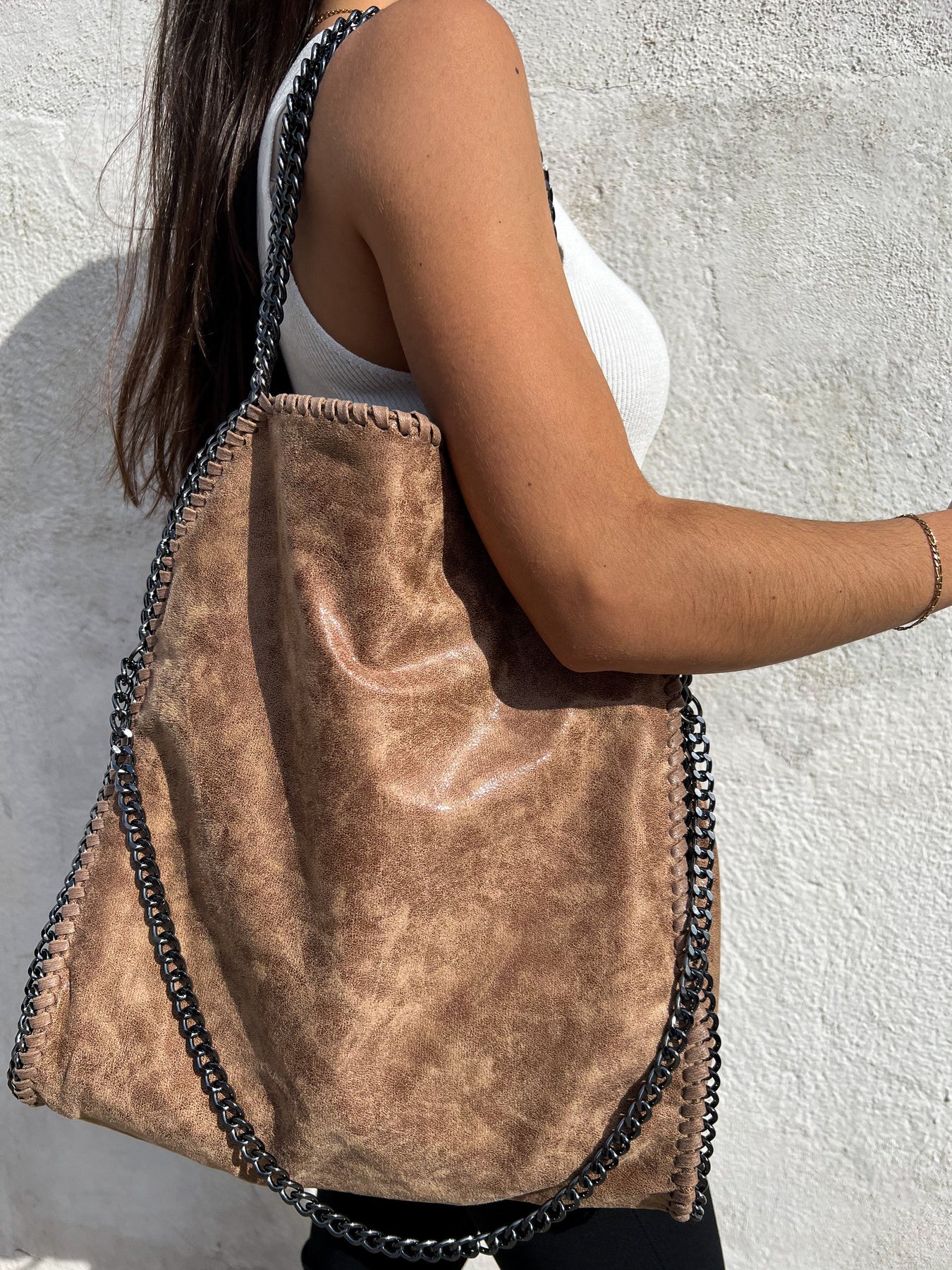 Patent leather bag type, with stitching detail black chains, ideal size to put computer and books. Possibility of multiposition.