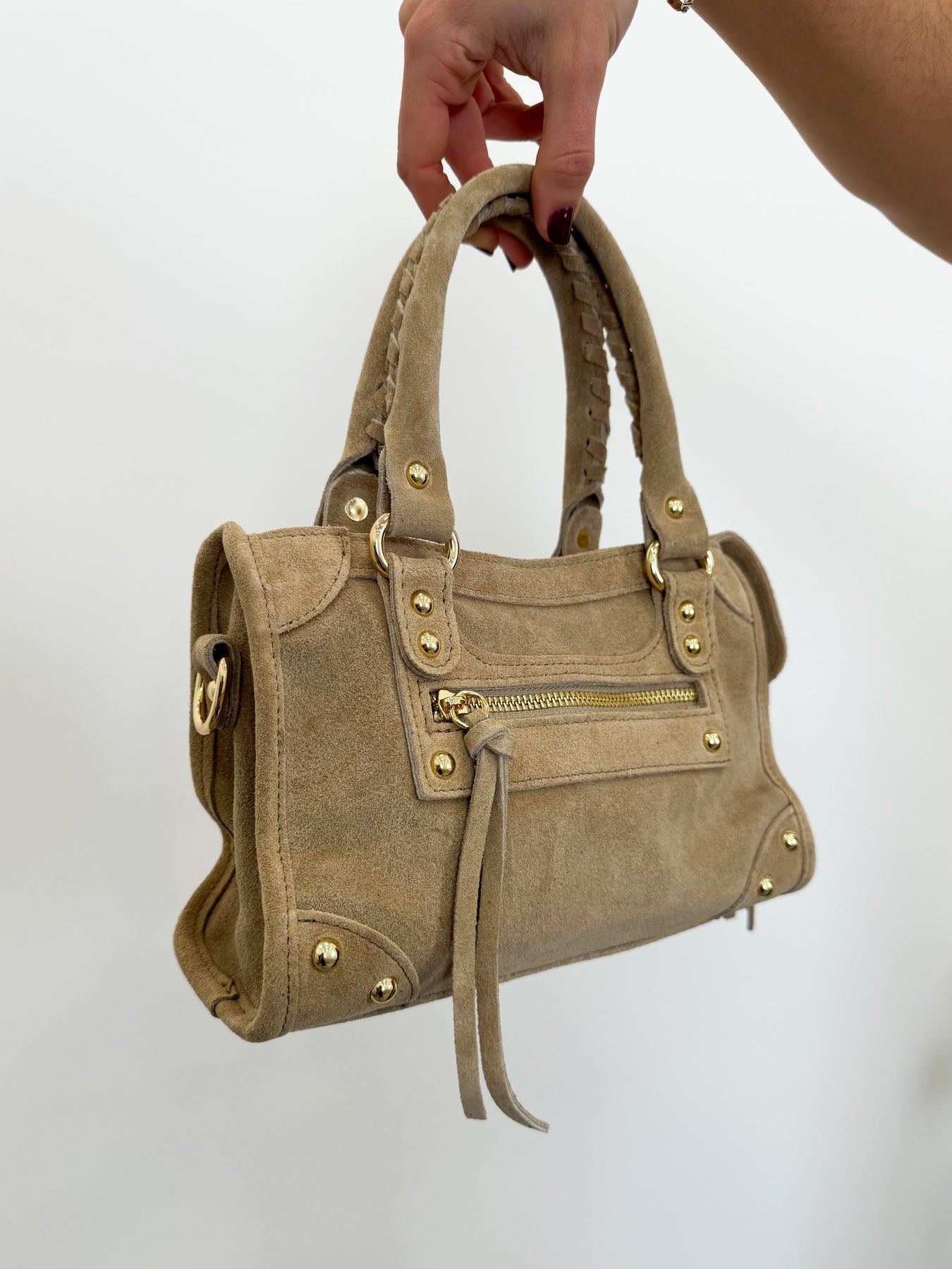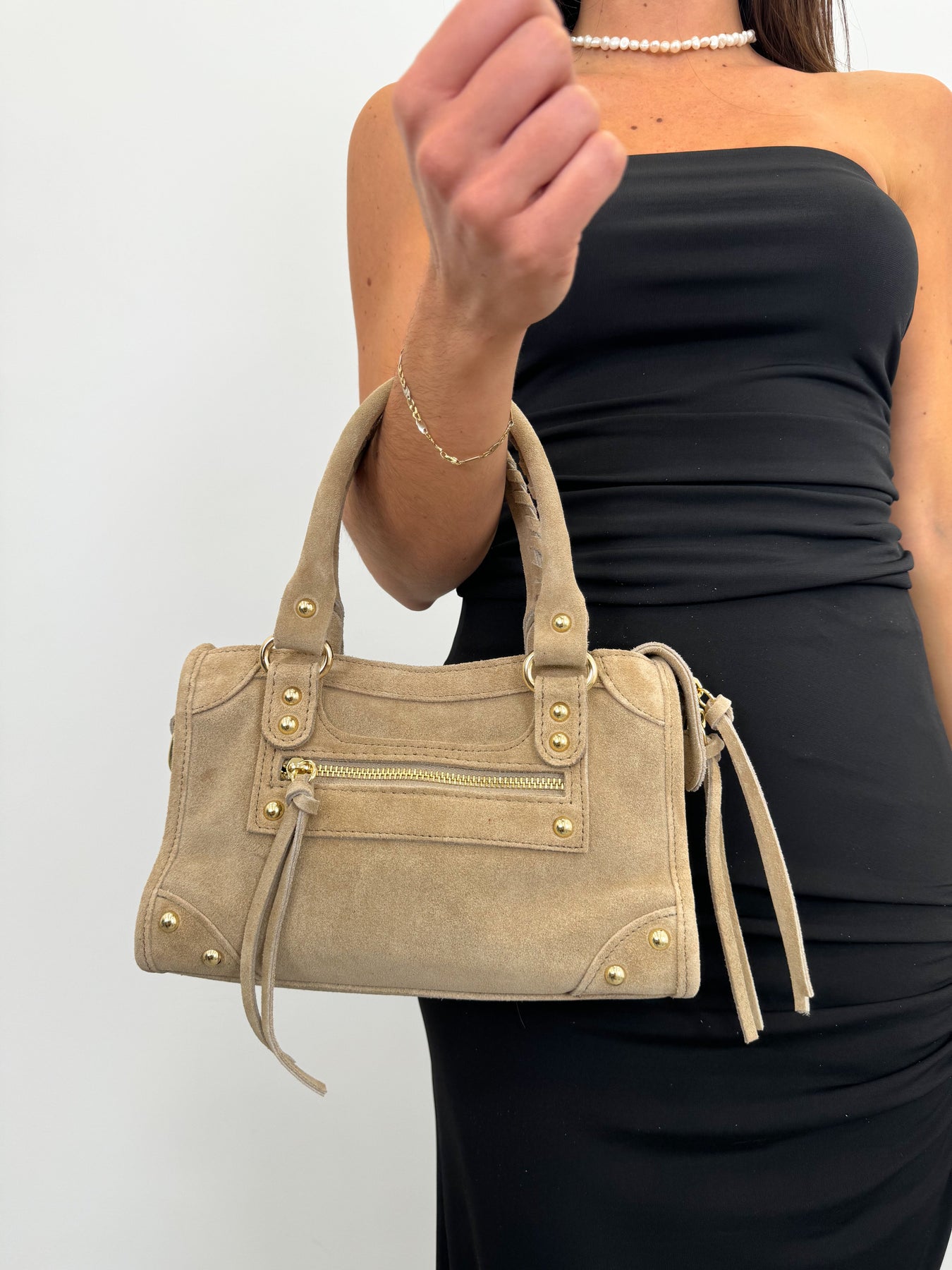 Leather midi bag with decorative beads detail.Adjustable detachable shoulder strap, front zippered pocket, zippered top closure, main compartment, interior zippered pocket.