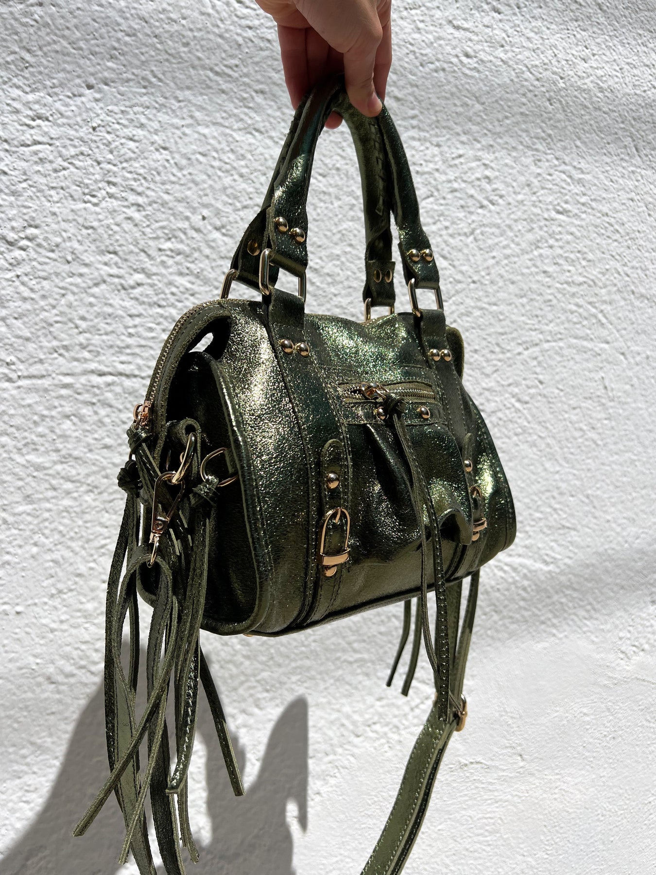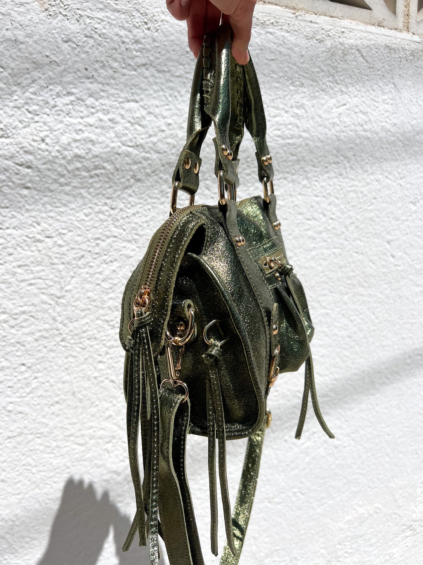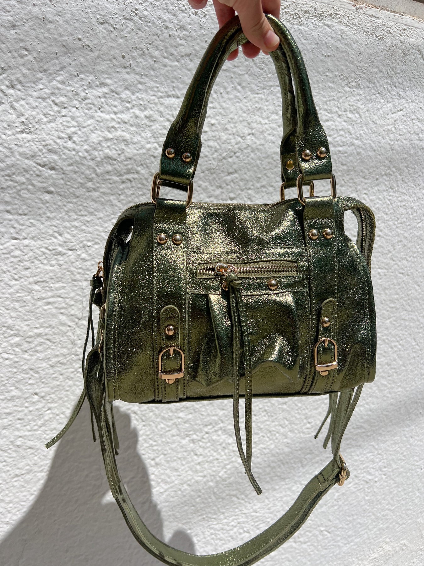 Leather midi bag with decorative buckle detail.Adjustable detachable shoulder strap, front zippered pocket, zippered top closure, main compartment, interior zippered pocket.
