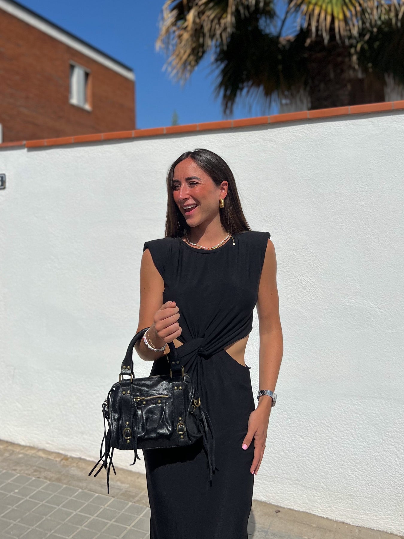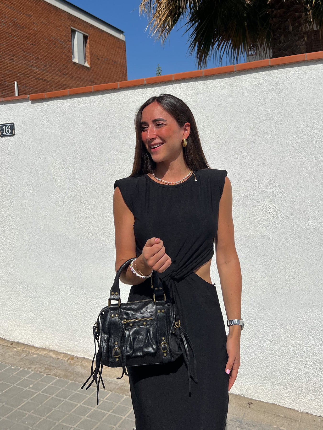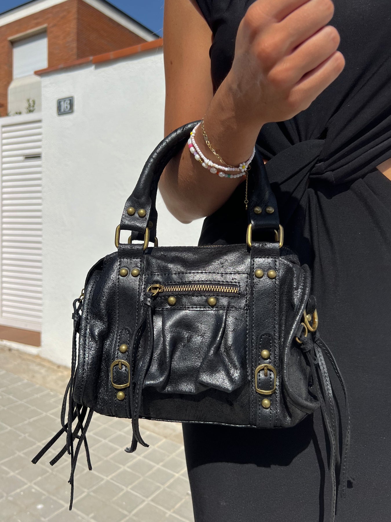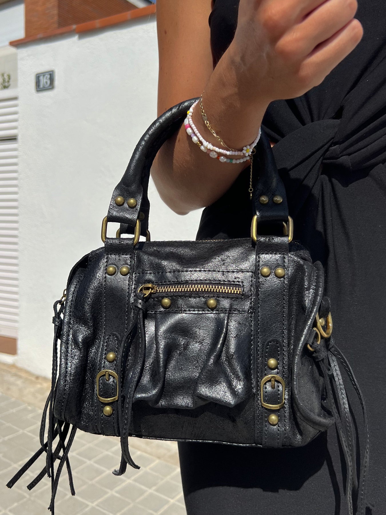 Leather midi bag with decorative buckle detail.Adjustable detachable shoulder strap, front zippered pocket, zippered top closure, main compartment, interior zippered pocket.
