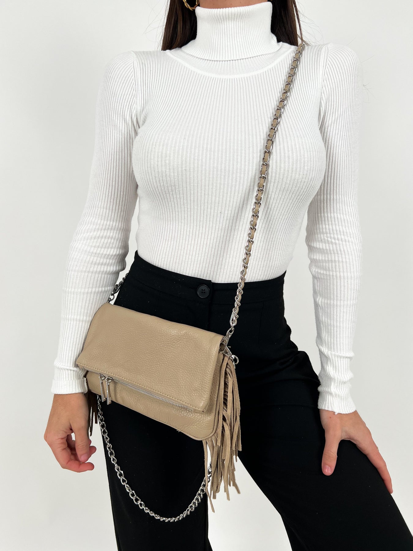 Small leather bag, with two removable silver-colored metal chains intertwined with leather, flat pocket on the front, can be worn on the shoulder or crossed on shoulder strap.Bangs on the sides.