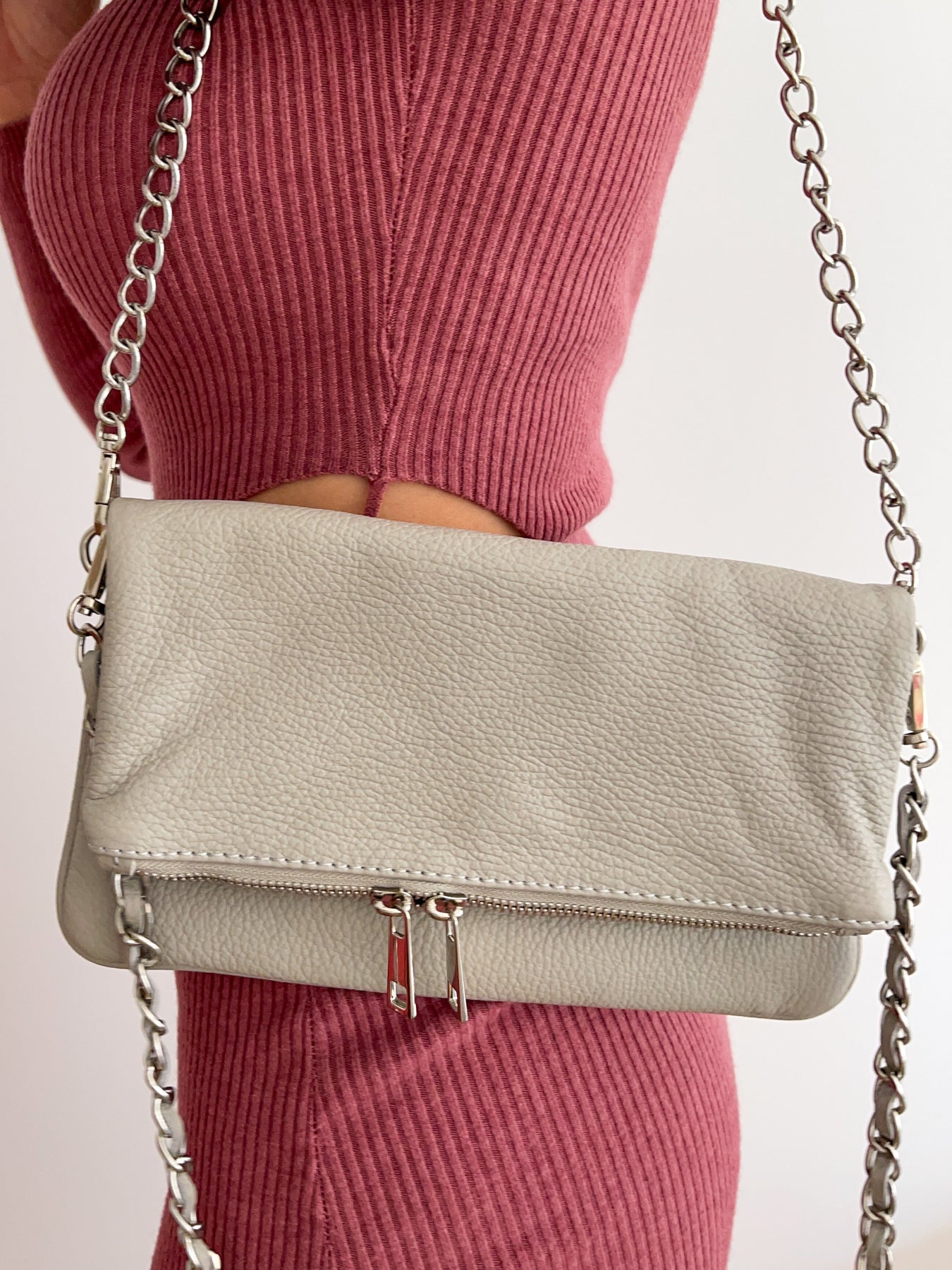 Small leather bag, ice color, with two removable silver-colored metal chains intertwined with leather, flat pocket on the front, can be worn over the shoulder or across the shoulder.