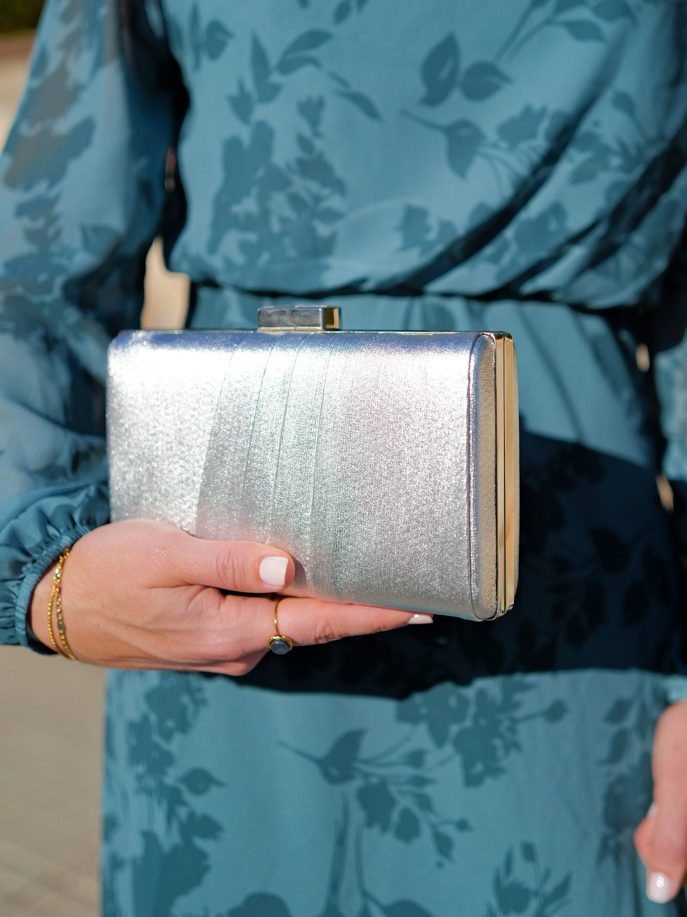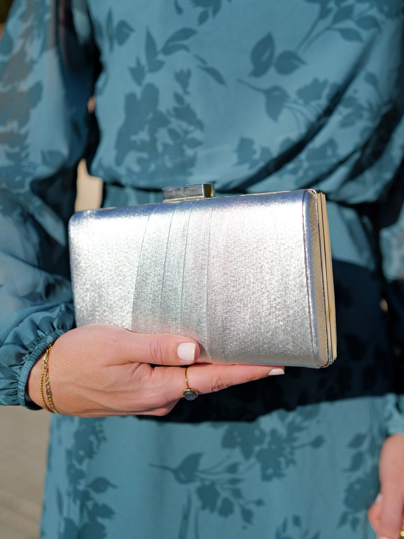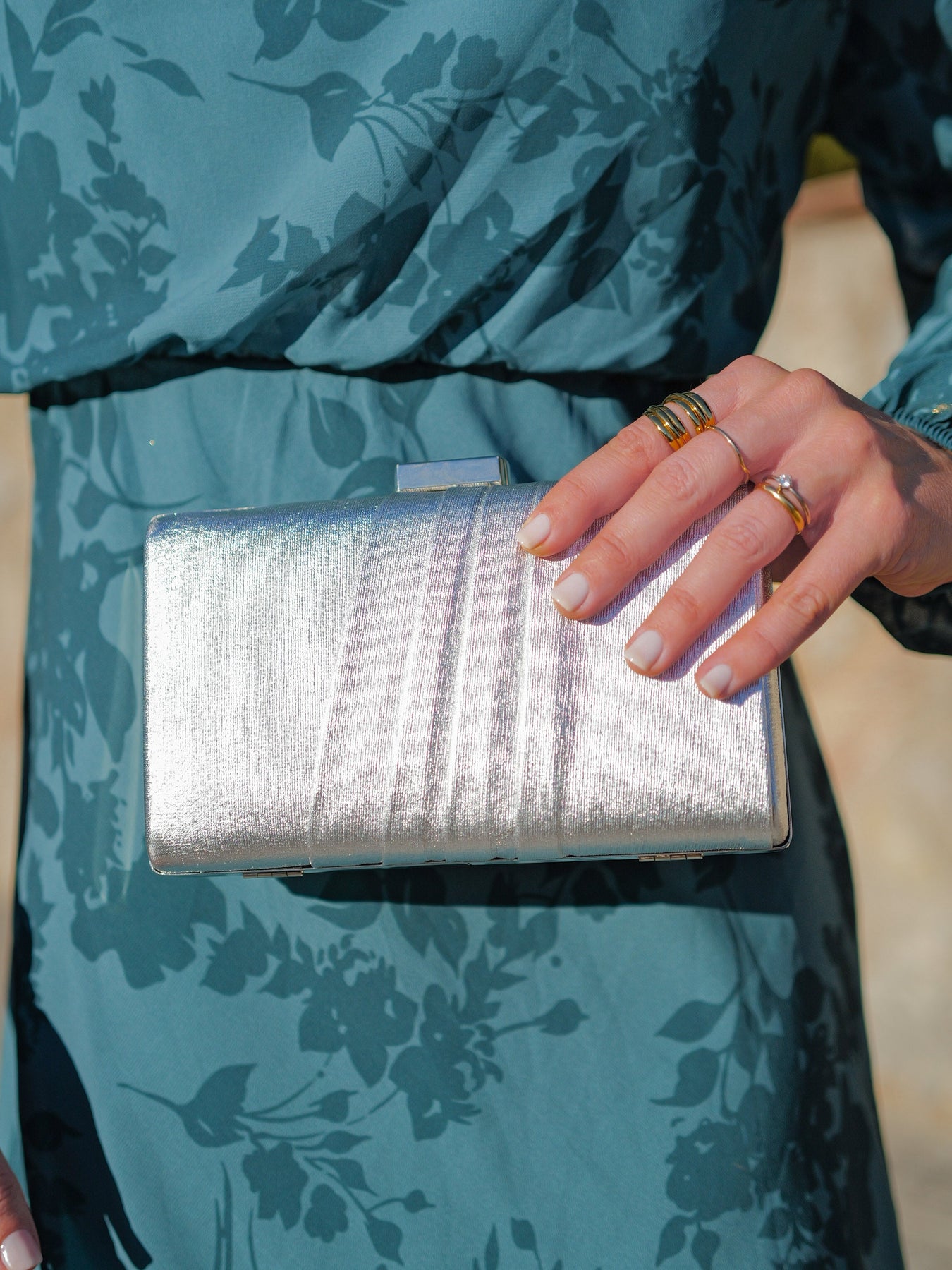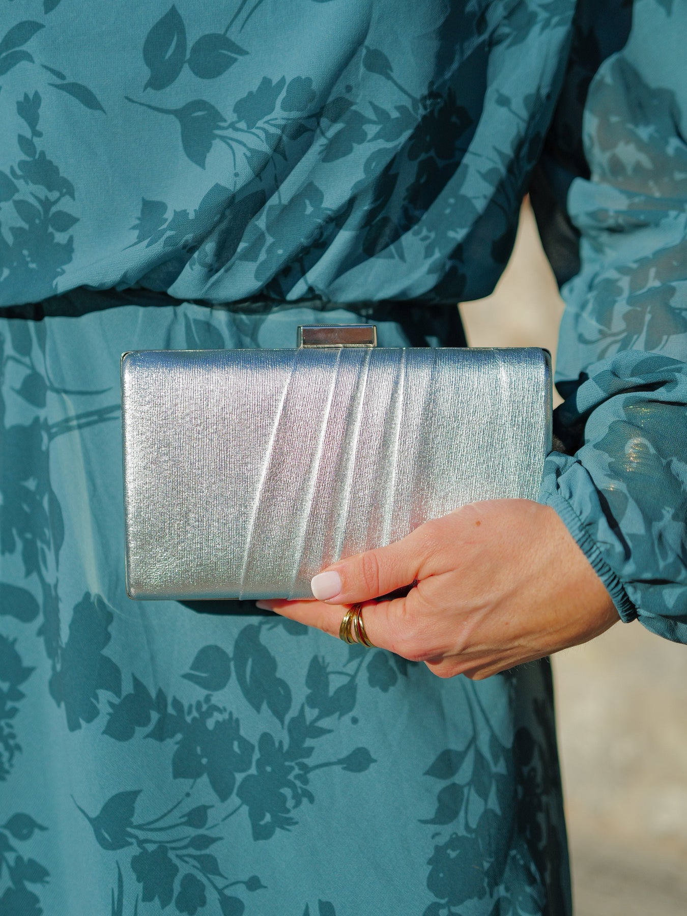 Smooth golden bag with satin effect and banded design, it is a small handbag. Closure with golden stone with glitter designs. It has a removable chain. Rectangular shape